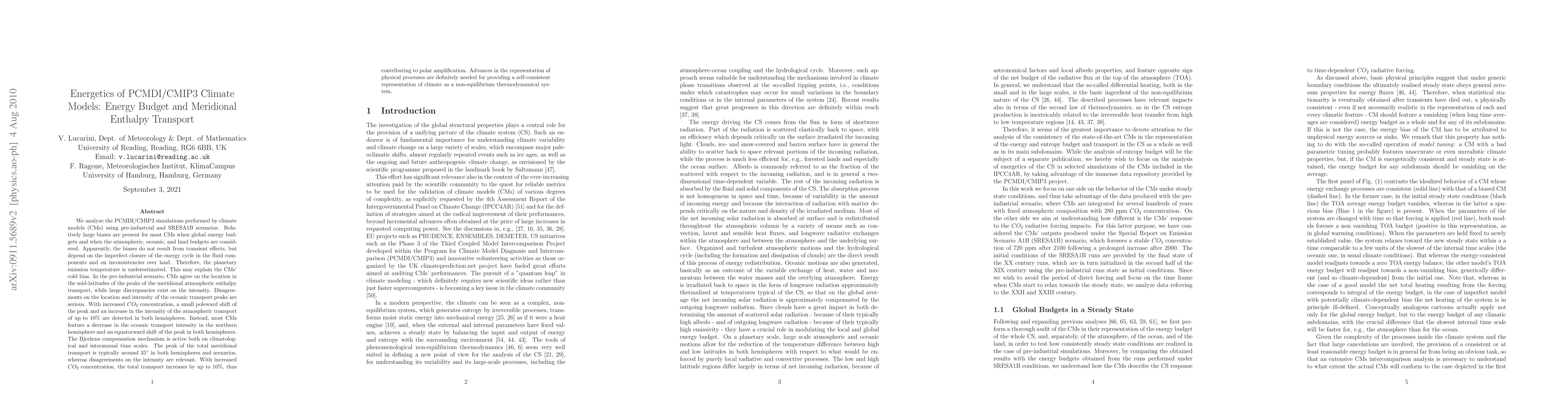 This paper analyzes PCMDI/CMIP3 climate models, finding significant biases in global and component energy budgets due to imperfect energy closure and land inconsistencies, leading to a cold bias. It also highlights discrepancies in meridional enthalpy transport, with atmospheric transport increasing slightly and oceanic transport decreasing under increased $CO_2$ scenarios, emphasizing the need for improved model physics.