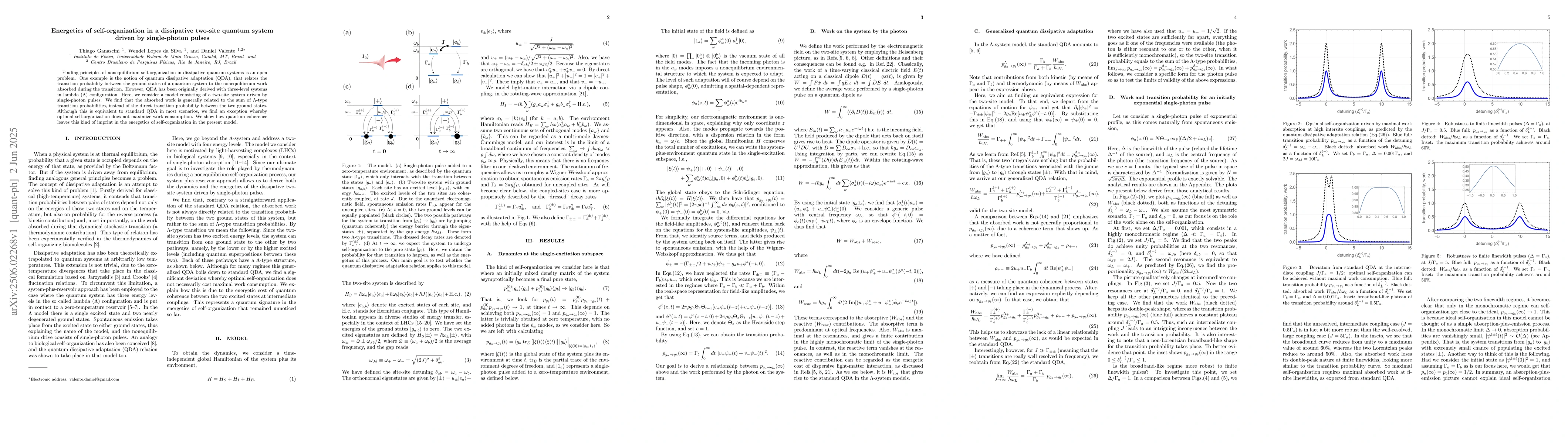 The paper extends the concept of quantum dissipative adaptation (QDA) to a two-site system driven by single-photon pulses, revealing how quantum coherence impacts self-organization energetics.