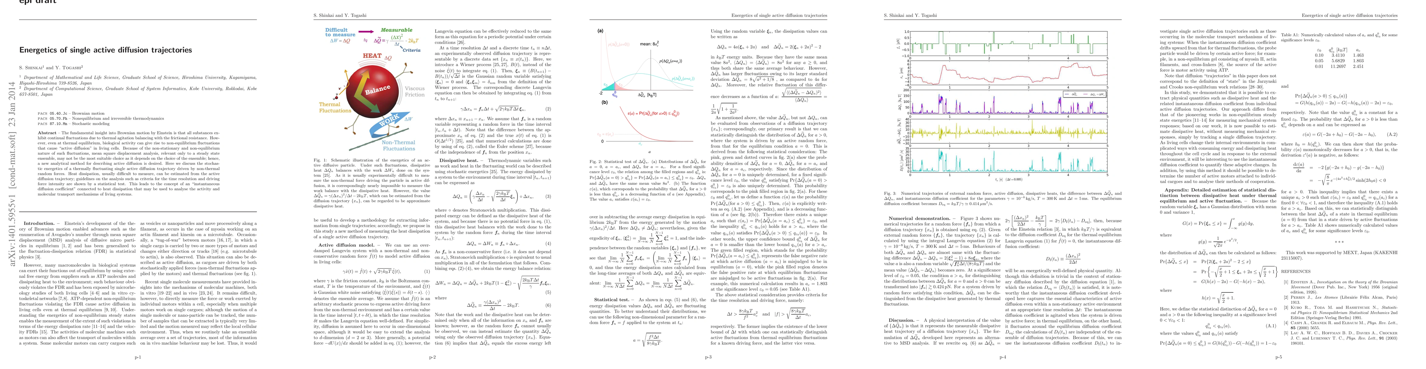 The fundamental insight into Brownian motion by Einstein is that all substances exhibit continual fluctuations due to thermal agitation balancing with the frictional resistance. However, even at thermal equilibrium, biological activity can give rise to non-equilibrium fluctuations that cause ``active diffusion" in living cells. Because of the non-stationary and non-equilibrium nature of such fluctuations, mean square displacement analysis, relevant only to a steady state ensemble, may not be the most suitable choice as it depends on the choice of the ensemble; hence, a new analytical method for describing active diffusion is desired. Here we discuss the stochastic energetics of a thermally fluctuating single active diffusion trajectory driven by non-thermal random forces. Heat dissipation, usually difficult to measure, can be estimated from the active diffusion trajectory; guidelines on the analysis such as criteria for the time resolution and driving force intensity are shown by a statistical test. This leads to the concept of an ``instantaneous diffusion coefficient" connected to heat dissipation that may be used to analyse the activity and molecular transport mechanisms of living systems.
