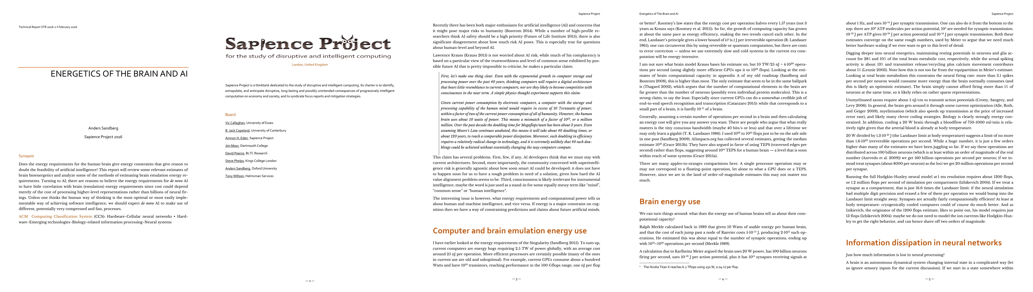 Does the energy requirements for the human brain give energy constraints that give reason to doubt the feasibility of artificial intelligence? This report will review some relevant estimates of brain bioenergetics and analyze some of the methods of estimating brain emulation energy requirements. Turning to AI, there are reasons to believe the energy requirements for de novo AI to have little correlation with brain (emulation) energy requirements since cost could depend merely of the cost of processing higher-level representations rather than billions of neural firings. Unless one thinks the human way of thinking is the most optimal or most easily implementable way of achieving software intelligence, we should expect de novo AI to make use of different, potentially very compressed and fast, processes.
