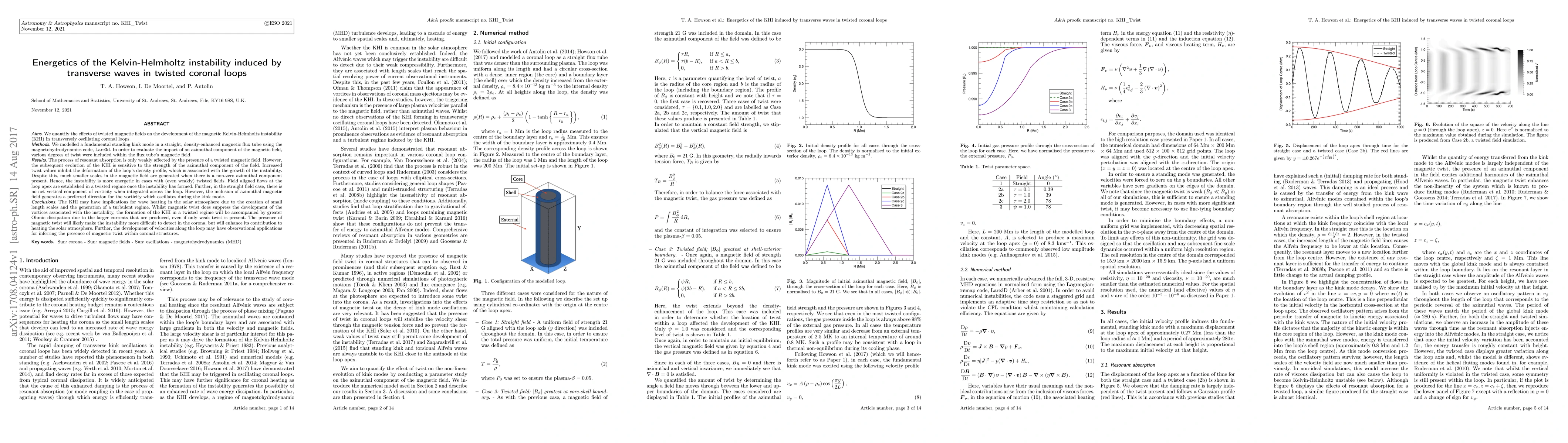 This study investigates how twisted magnetic fields influence the Kelvin-Helmholtz instability (KHI) in transversely oscillating coronal loops. The research finds that while twisted fields slightly inhibit KHI development, they significantly increase its energy and generate smaller magnetic scales, leading to greater Ohmic dissipation and potential wave heating in the solar atmosphere.