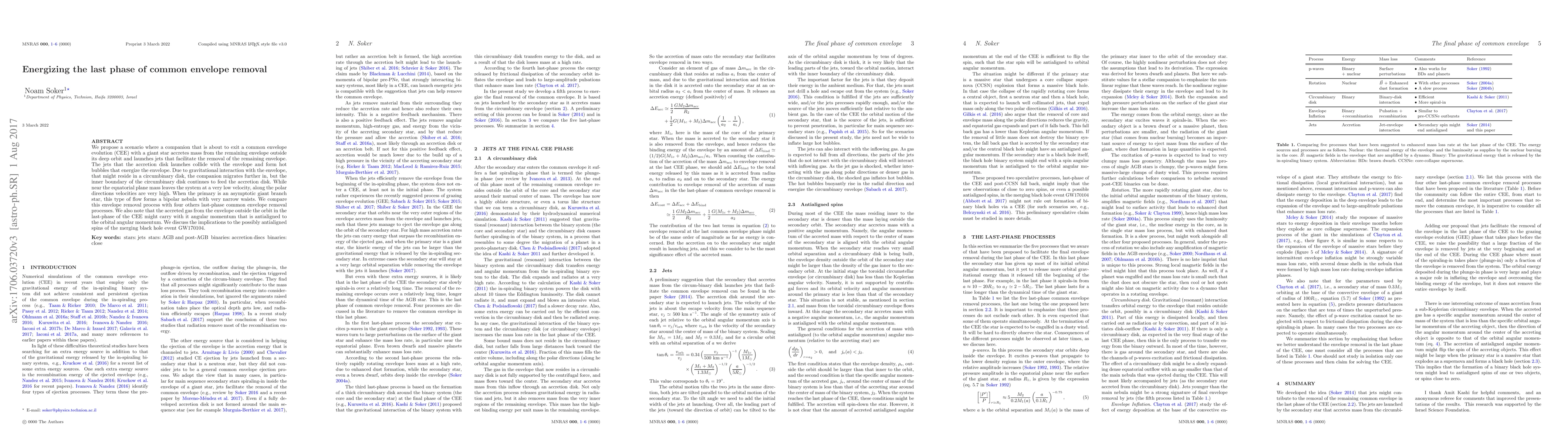 We propose a scenario where a companion that is about to exit a common envelope evolution (CEE) with a giant star accretes mass from the remaining envelope outside its deep orbit and launches jets that facilitate the removal of the remaining envelope. The jets that the accretion disk launches collide with the envelope and form hot bubbles that energize the envelope. Due to gravitational interaction with the envelope, that might reside in a circumbinary disk, the companion migrates further in, but the inner boundary of the circumbinary disk continues to feed the accretion disk. While near the equatorial plane mass leaves the system at a very low velocity, along the polar directions velocities are very high. When the primary is an asymptotic giant branch star, this type of flow forms a bipolar nebula with very narrow waists. We compare this envelope removal process with four others last-phase common envelope removal processes. We also note that the accreted gas from the envelope outside the orbit in the last-phase of the CEE might carry with it angular momentum that is antialigned to the orbital angular momentum. We discuss the implications to the possibly antialigned spins of the merging black hole event GW170104.