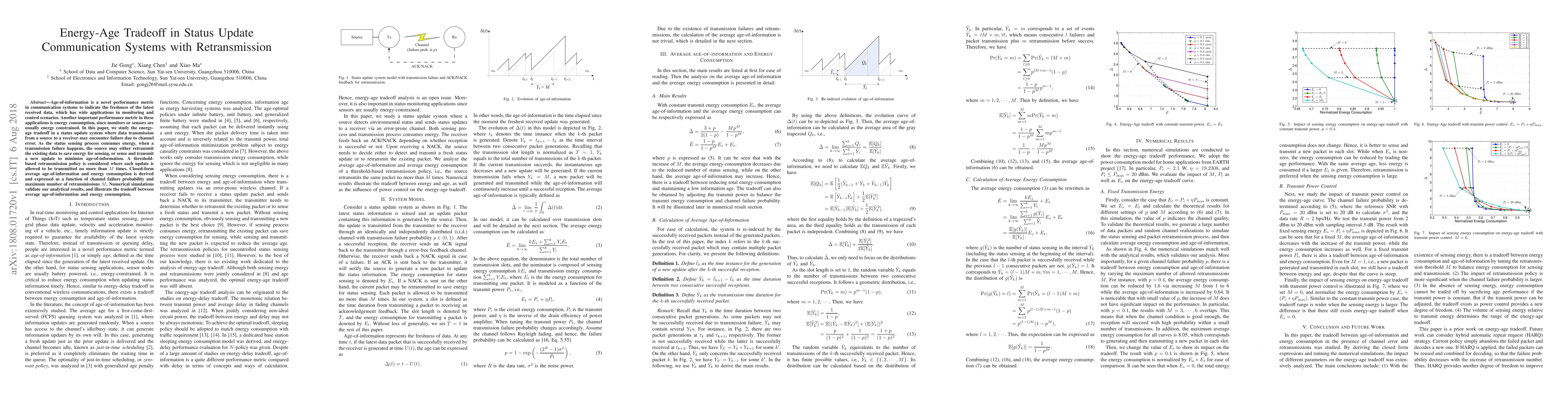 This paper investigates the energy-age tradeoff in status update communication systems with retransmission, deriving closed-form expressions for average age-of-information and energy consumption. It explores a threshold-based retransmission policy to balance energy efficiency and data freshness, validated through numerical simulations.