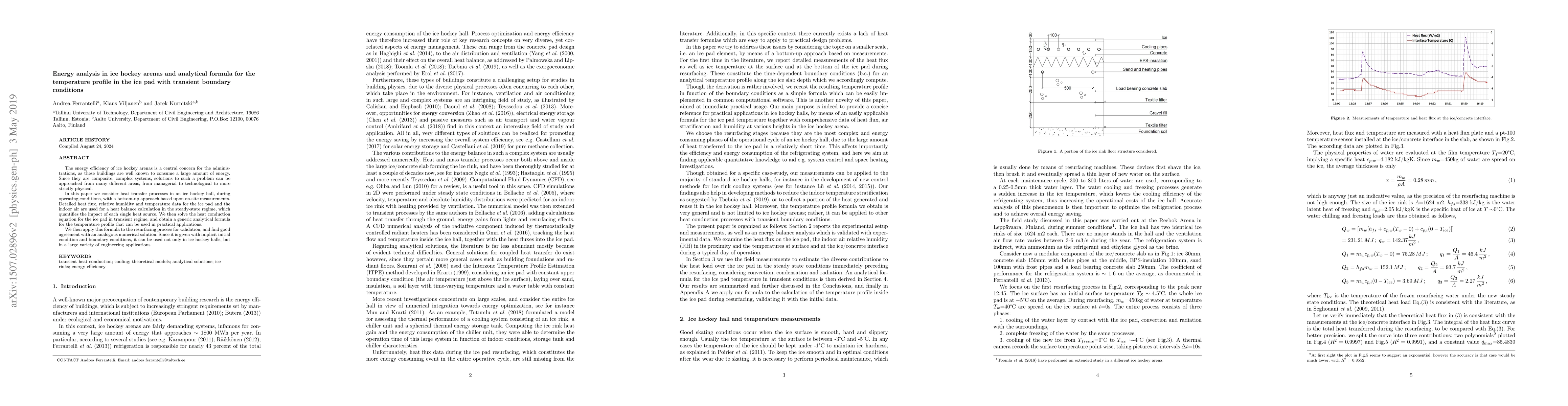 The energy efficiency of ice hockey arenas is a central concern for the administrations, as these buildings are well known to consume a large amount of energy. Since they are composite, complex systems, solutions to such a problem can be approached from many different areas, from managerial to technological to more strictly physical. In this paper we consider heat transfer processes in an ice hockey hall, during operating conditions, with a bottom-up approach based upon on-site measurements. Detailed heat flux, relative humidity and temperature data for the ice pad and the indoor air are used for a heat balance calculation in the steady-state regime, which quantifies the impact of each single heat source. We then solve the heat conduction equation for the ice pad in transient regime, and obtain a generic analytical formula for the temperature profile that can be used in practical applications. We then apply this formula to the resurfacing process for validation, and find good agreement with an analogous numerical solution. Since it is given with implicit initial condition and boundary conditions, it can be used not only in ice hockey halls, but in a large variety of engineering applications.