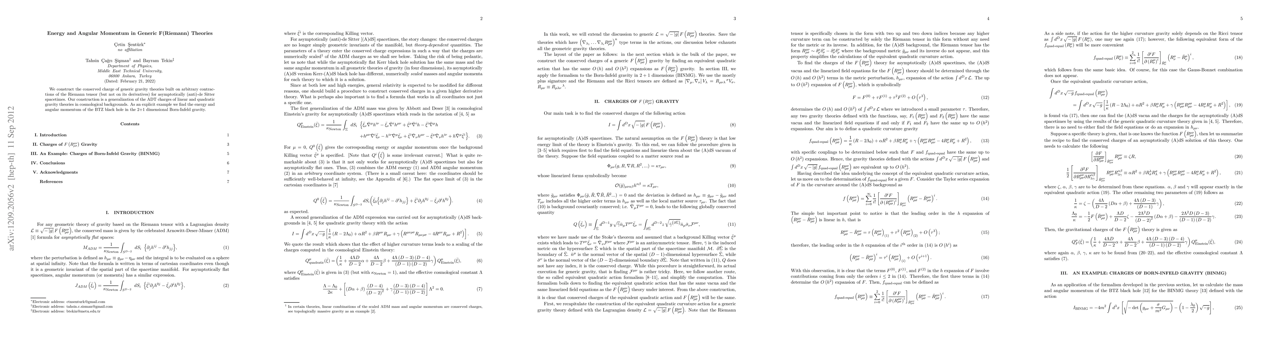 This paper generalizes the Abbott-Deser-Tekin (ADT) charges to generic F(Riemann) gravity theories, constructing conserved quantities for asymptotically (anti)-de Sitter spacetimes. It specifically calculates the energy and angular momentum for a BTZ black hole in 2+1 dimensional Born-Infeld gravity.