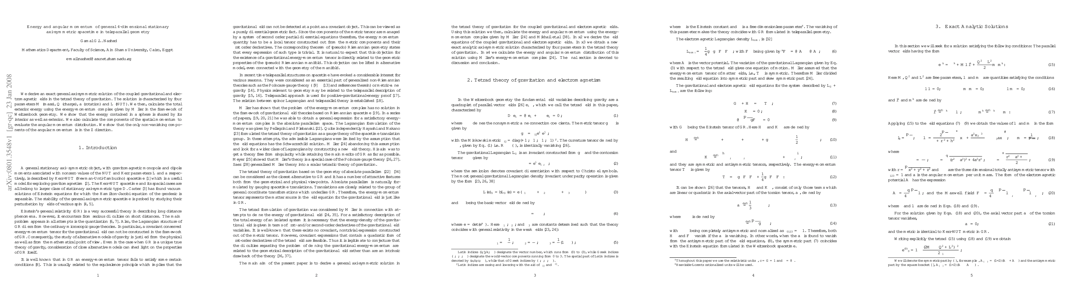 This paper derives a general axi-symmetric solution in teleparallel geometry for coupled gravitational and electromagnetic fields, characterized by four parameters: mass, charge, rotation, and NUT. It calculates the total exterior energy and angular momentum using M{\o}ller's energy-momentum complex, showing that energy is shared between the interior and exterior of a sphere and that angular momentum is non-vanishing only in the Z direction.