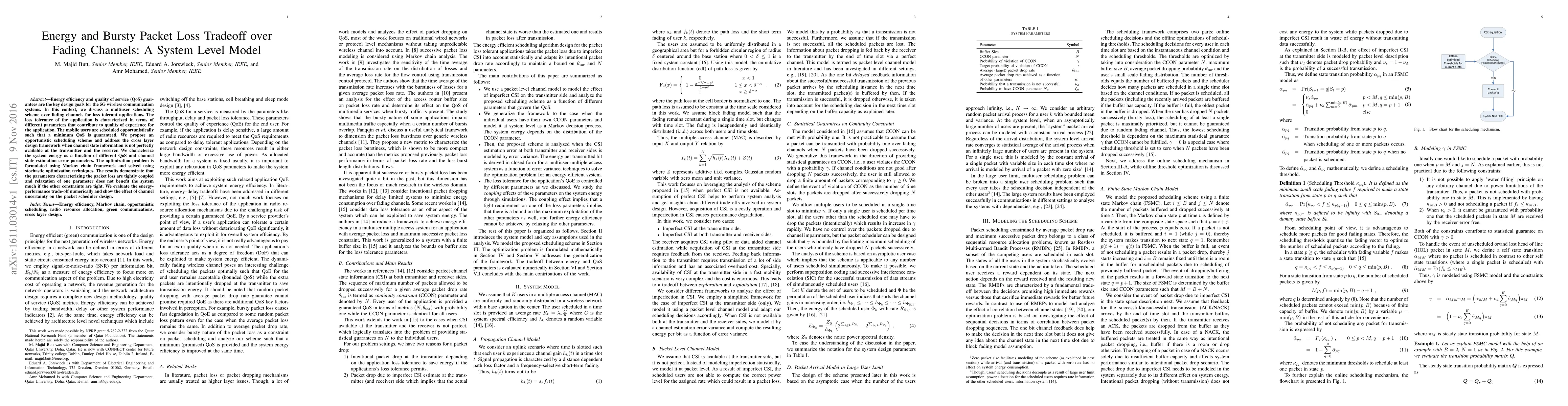 Energy efficiency and quality of service (QoS) guarantees are the key design goals for the 5G wireless communication systems. In this context, we discuss a multiuser scheduling scheme over fading channels for loss tolerant applications. The loss tolerance of the application is characterized in terms of different parameters that contribute to quality of experience for the application. The mobile users are scheduled opportunistically such that a minimum QoS is guaranteed. We propose an opportunistic scheduling scheme and address the cross layer design framework when channel state information is not perfectly available at the transmitter and the receiver. We characterize the system energy as a function of different QoS and channel state estimation error parameters. The optimization problem is formulated using Markov chain framework and solved using stochastic optimization techniques. The results demonstrate that the parameters characterizing the packet loss are tightly coupled and relaxation of one parameter does not benefit the system much if the other constraints are tight. We evaluate the energy-performance trade-off numerically and show the effect of channel uncertainty on the packet scheduler design.