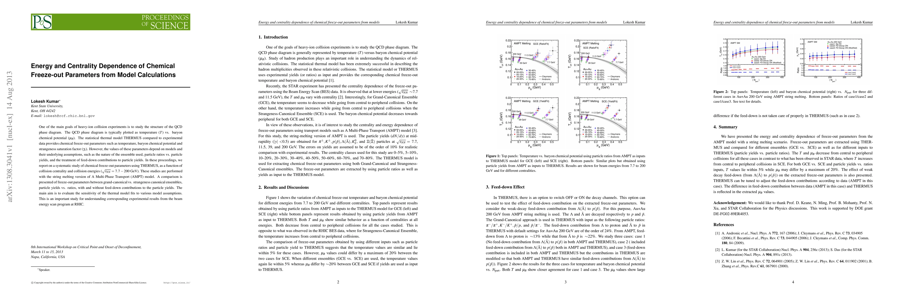 This paper investigates the energy and centrality dependence of chemical freeze-out parameters in heavy-ion collisions using the THERMUS model, comparing grand-canonical vs. strangeness canonical ensembles and including/excluding feed-down contributions. The study aims to assess the sensitivity of these parameters to different model assumptions, crucial for interpreting RHIC beam energy scan results.