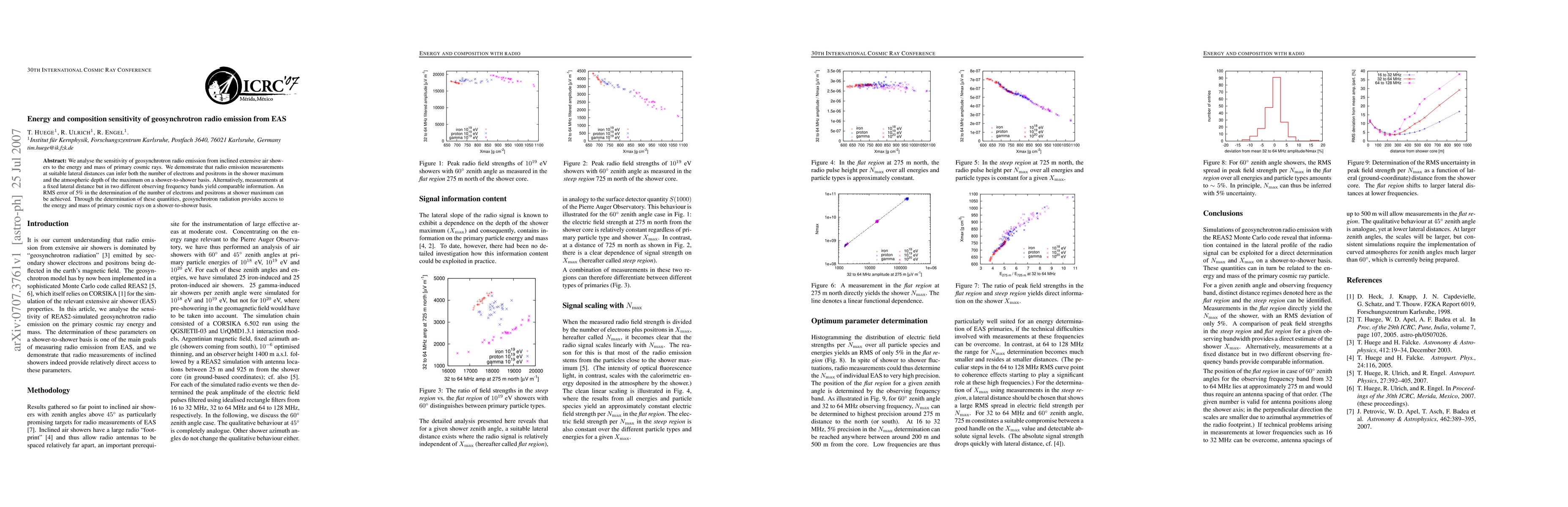 This paper investigates how geosynchrotron radio emission from inclined extensive air showers (EAS) can be used to determine the energy and composition of primary cosmic rays. It shows that radio emission measurements can infer both the number of electrons and positrons in the shower's maximum and the atmospheric depth of the maximum, achieving an RMS error of 5%.