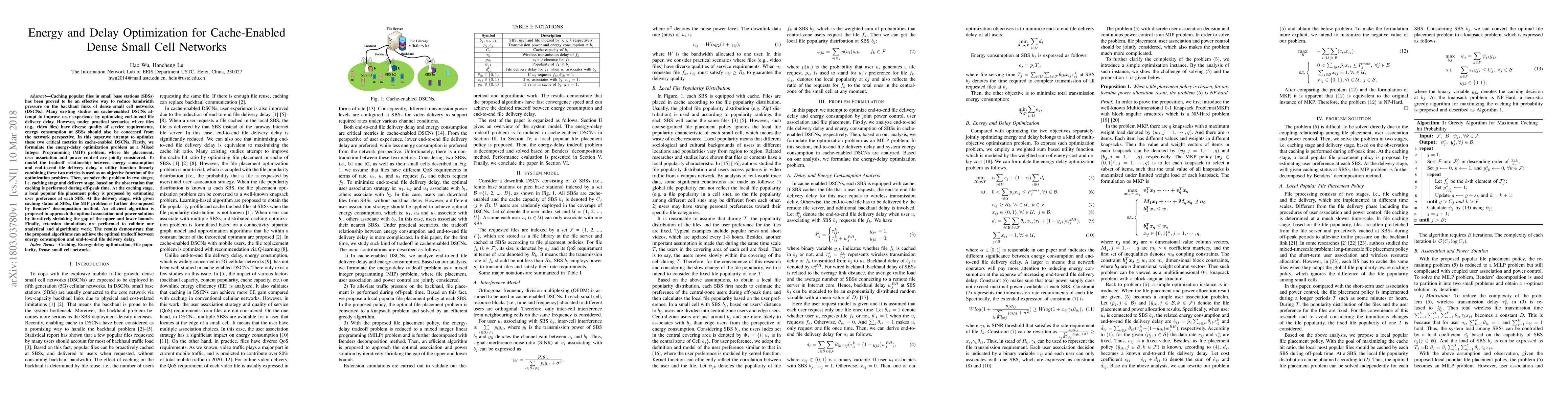This paper proposes an optimization framework for cache-enabled dense small cell networks to balance energy consumption and end-to-end file delivery delay. It formulates the optimization problem as a Mixed Integer Programming (MIP) and solves it in two stages using a local popular file placement policy and Benders' decomposition method.