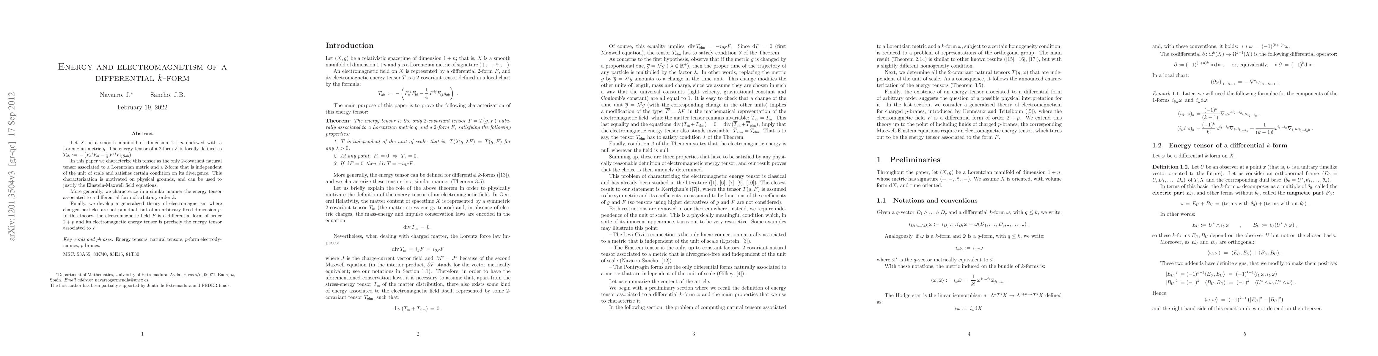 This paper characterizes the electromagnetic energy tensor T as the unique 2-covariant tensor tied to a Lorentzian metric and a 2-form, independent of scale and satisfying specific divergence conditions, which supports the Einstein-Maxwell equations. It extends this characterization to tensors associated with differential forms of any order k.
