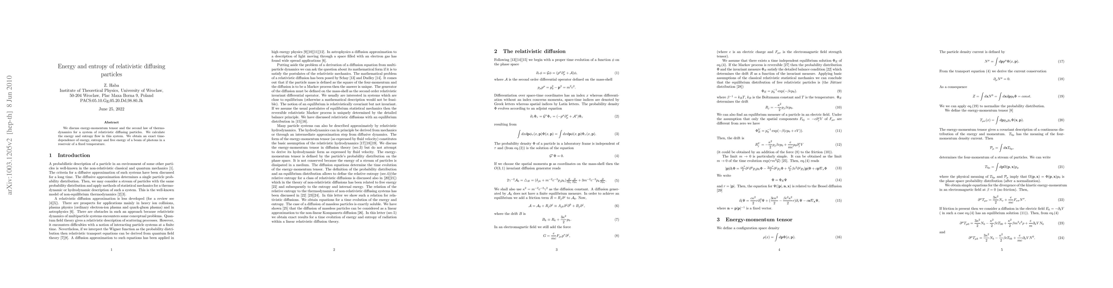 This research paper explores the energy and entropy of relativistic diffusing particles, calculating their flow in a system and obtaining an exact time dependence for photon beams in a reservoir at fixed temperature.
