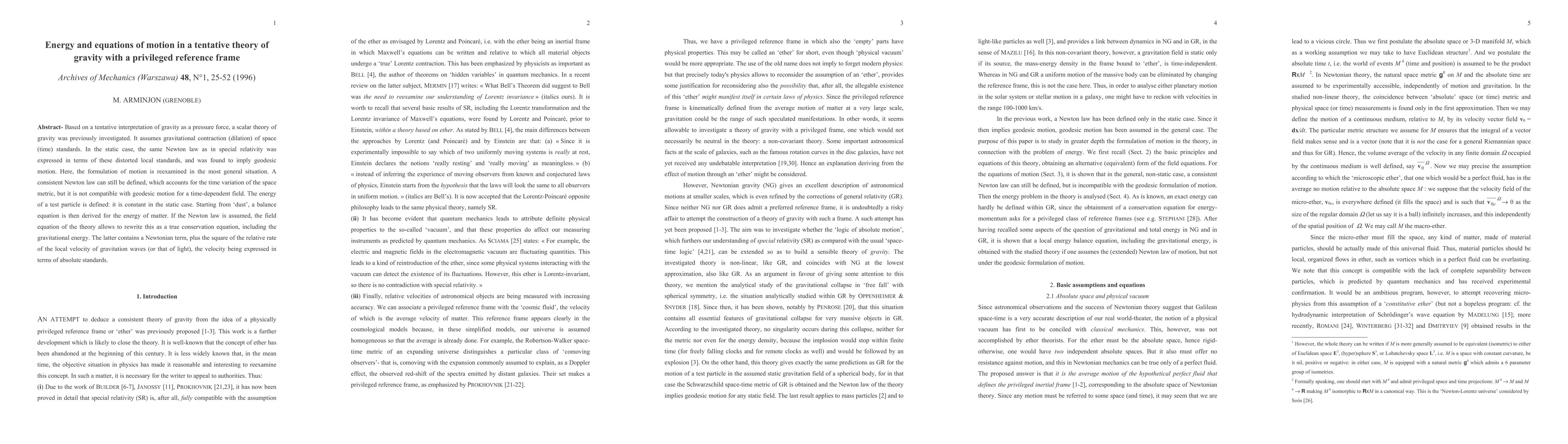 Based on a tentative interpretation of gravity as a pressure force, a scalar theory of gravity was previously investigated. It assumes gravitational contraction (dilation) of space (time) standards. In the static case, the same Newton law as in special relativity was expressed in terms of these distorted local standards, and was found to imply geodesic motion. Here, the formulation of motion is reexamined in the most general situation. A consistent Newton law can still be defined, which accounts for the time variation of the space metric, but it is not compatible with geodesic motion for a time-dependent field. The energy of a test particle is defined: it is constant in the static case. Starting from 'dust', a balance equation is then derived for the energy of matter. If the Newton law is assumed, the field equation of the theory allows to rewrite this as a true conservation equation, including the gravitational energy. The latter contains a Newtonian term, plus the square of the relative rate of the local velocity of gravitation waves (or that of light), the velocity being expressed in terms of absolute standards.