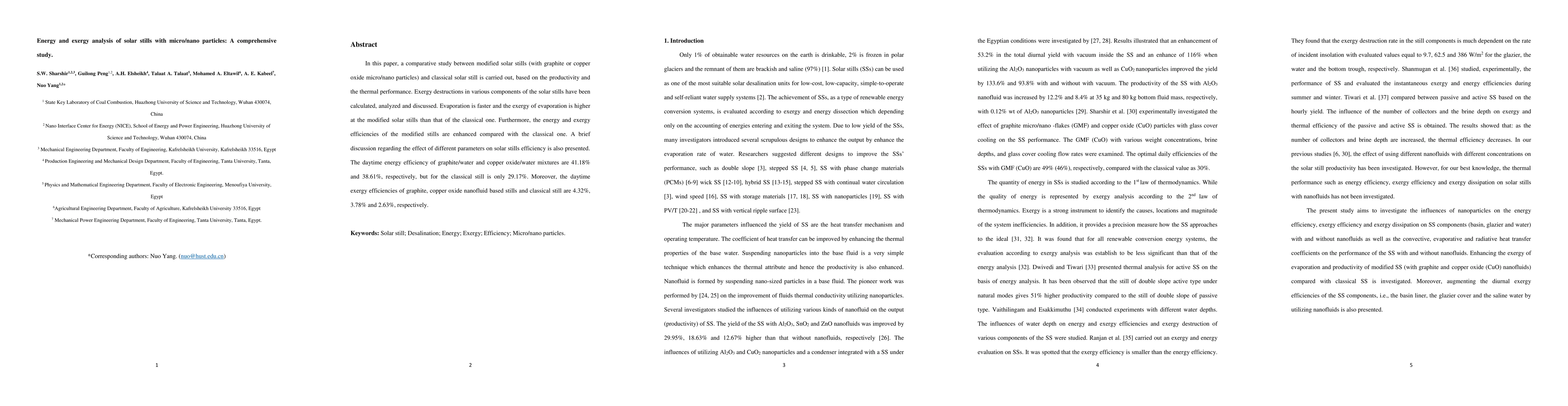 This paper compares the productivity and thermal performance of solar stills modified with graphite or copper oxide micro/nano particles against classical solar stills, finding enhanced energy and exergy efficiencies in the modified versions. The study also analyzes exergy destructions and concludes that the modified stills achieve higher evaporation rates and efficiencies.