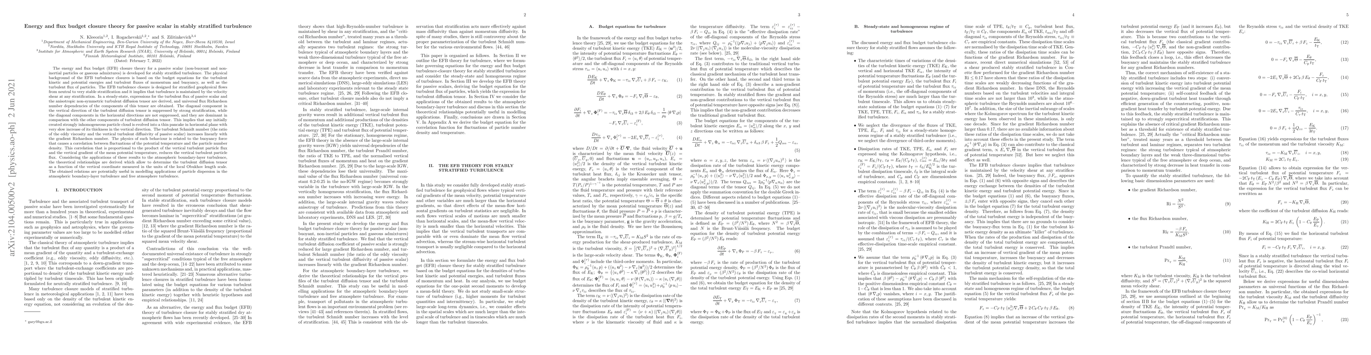 This paper develops a theory for the energy and flux budget closure of passive scalars in stably stratified turbulence, focusing on the turbulent kinetic and potential energies, and fluxes of momentum and buoyancy. The derived relationships show that strong stratification suppresses vertical turbulent diffusion while enhancing horizontal diffusion, leading to the formation of thin, horizontally extended particle clouds. The results are applicable to atmospheric boundary-layer turbulence and can improve models for particle dispersion.