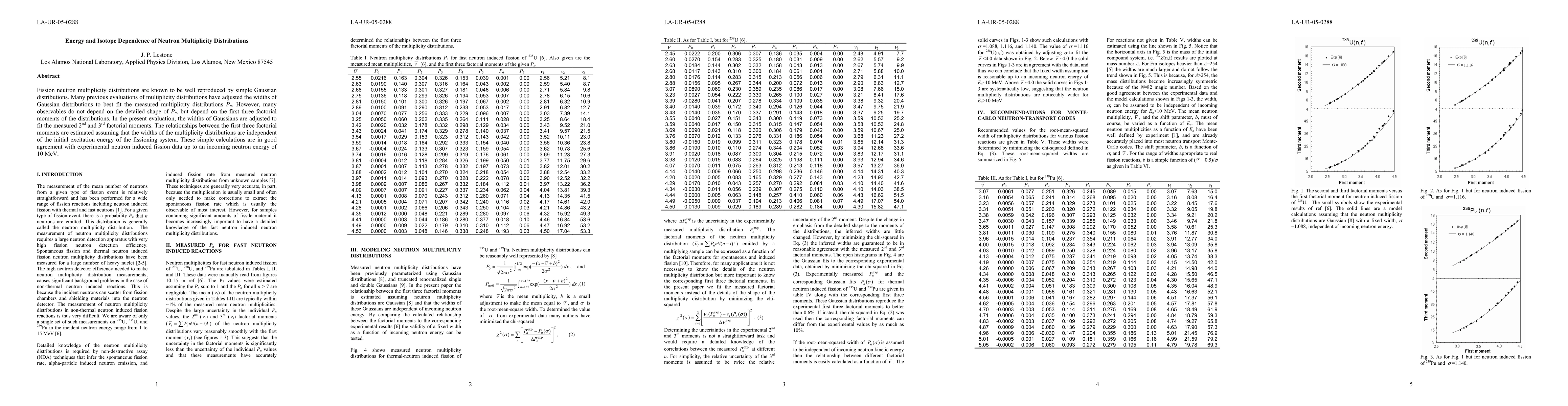 This paper evaluates neutron multiplicity distributions in fission using Gaussian fits, adjusting the widths to match the 2nd and 3rd factorial moments rather than the full distribution shape. The study finds that these moments correlate well with experimental data for neutron-induced fission up to 10 MeV.