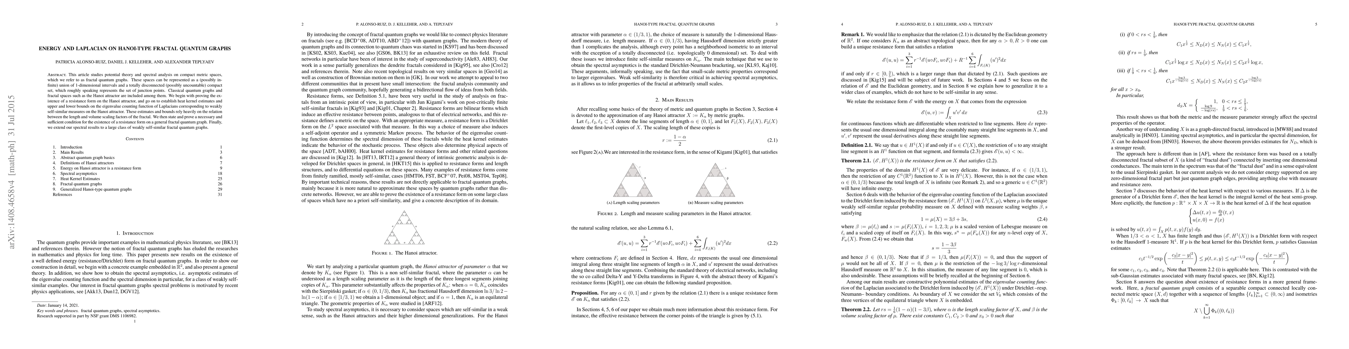Researchers investigated energy and spectral analysis on fractal quantum graphs, proving existence of resistance forms and providing heat kernel estimates for Hanoi-type fractals.