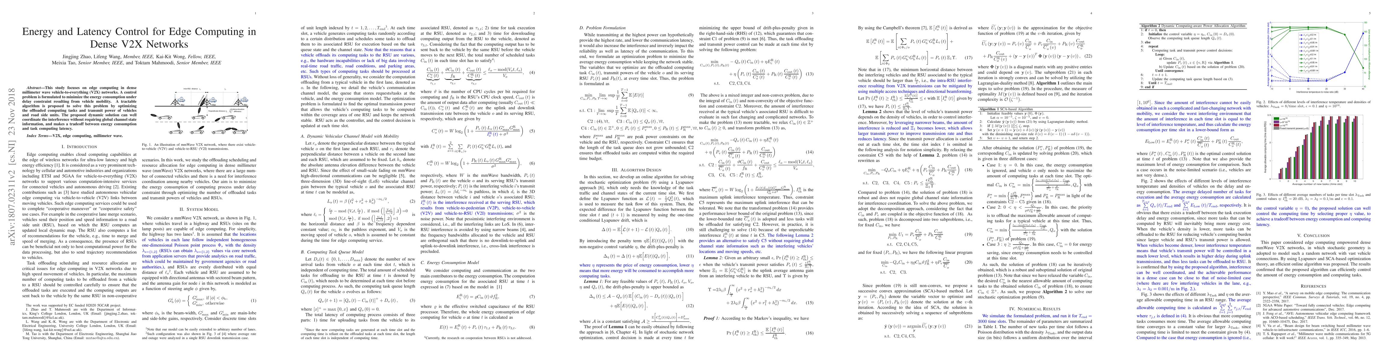 This study proposes an algorithm to optimize energy consumption and latency in dense V2X networks using edge computing, balancing offloaded tasks and transmit power while minimizing delay without global channel state information. The dynamic solution effectively coordinates interference and manages the trade-off between energy use and task latency.