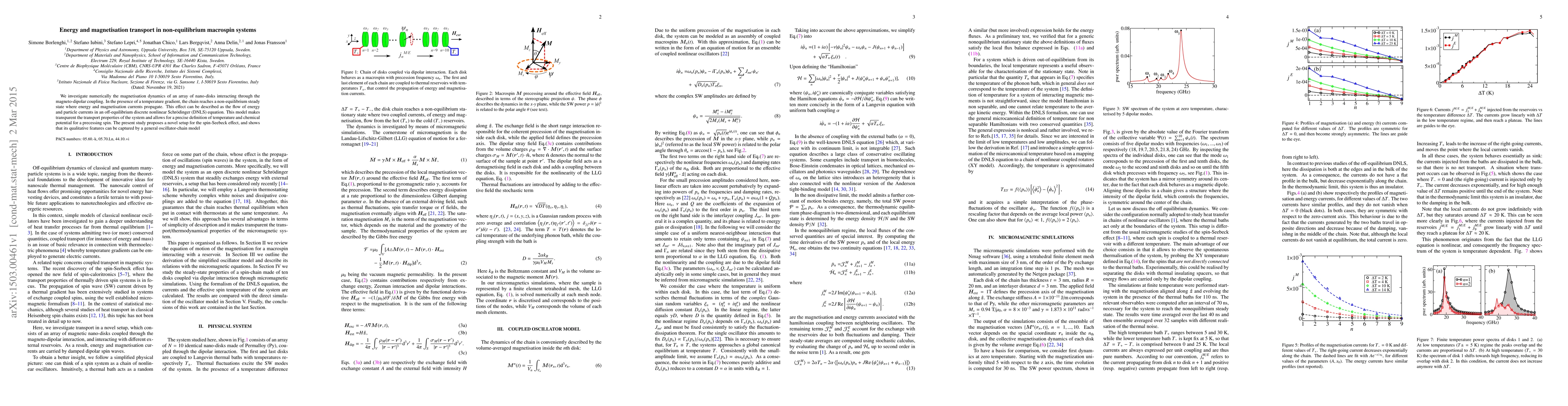 Researchers investigated how energy and magnetization move in tiny disk arrays with temperature gradients, discovering a non-equilibrium steady state where these currents flow. This work proposes a new setup for the spin-Seebeck effect, which can be understood using an oscillator-chain model.