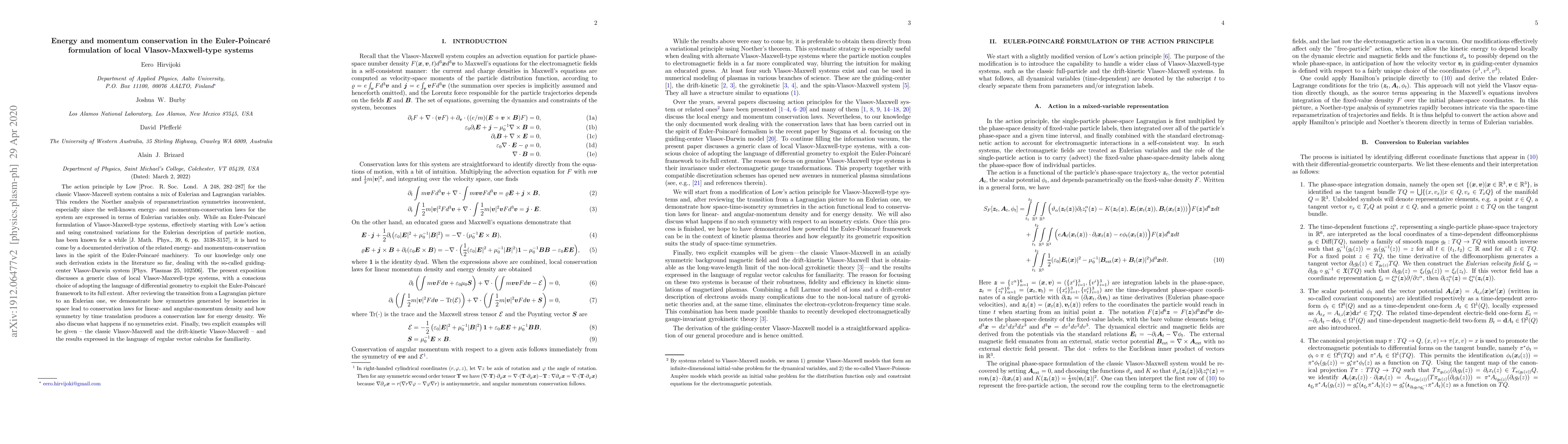 This paper presents a method using Euler-Poincar'e formulation and differential geometry to derive energy and momentum conservation laws in local Vlasov-Maxwell-type systems, including classic Vlasov-Maxwell and drift-kinetic Vlasov-Maxwell, providing explicit results in familiar vector calculus language.
