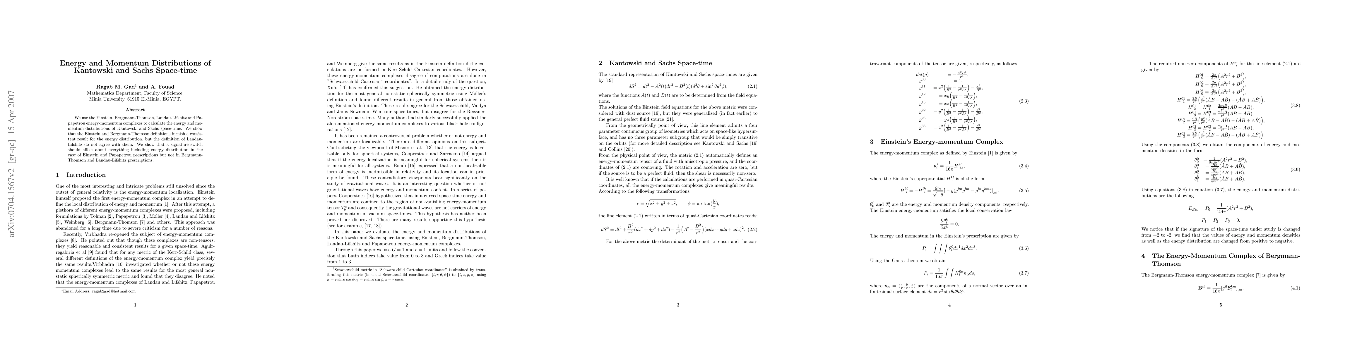 We use the Einstein, Bergmann-Thomson, Landau-Lifshitz and Papapetrou energy-momentum complexes to calculate the energy and momentum distributions of Kantowski and Sachs space-time. We show that the Einstein and Bergmann-Thomson definitions furnish a consistent result for the energy distribution, but the definition of Landau-Lifshitz do not agree with them. We show that a signature switch should affect about everything including energy distribution in the case of Einstein and Papapetrou prescriptions but not in Bergmann-Thomson and Landau-Lifshitz prescriptions.