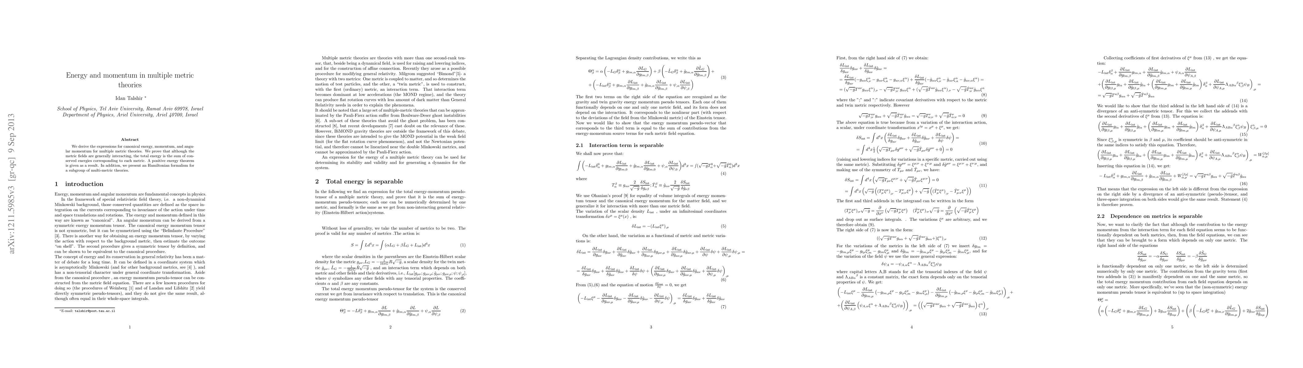 This paper derives expressions for energy, momentum, and angular momentum in multiple metric theories, proving that total energy is the sum of conserved energies for each metric, and presents a positive energy theorem. It also introduces an Hamiltonian formalism for a subgroup of these theories.