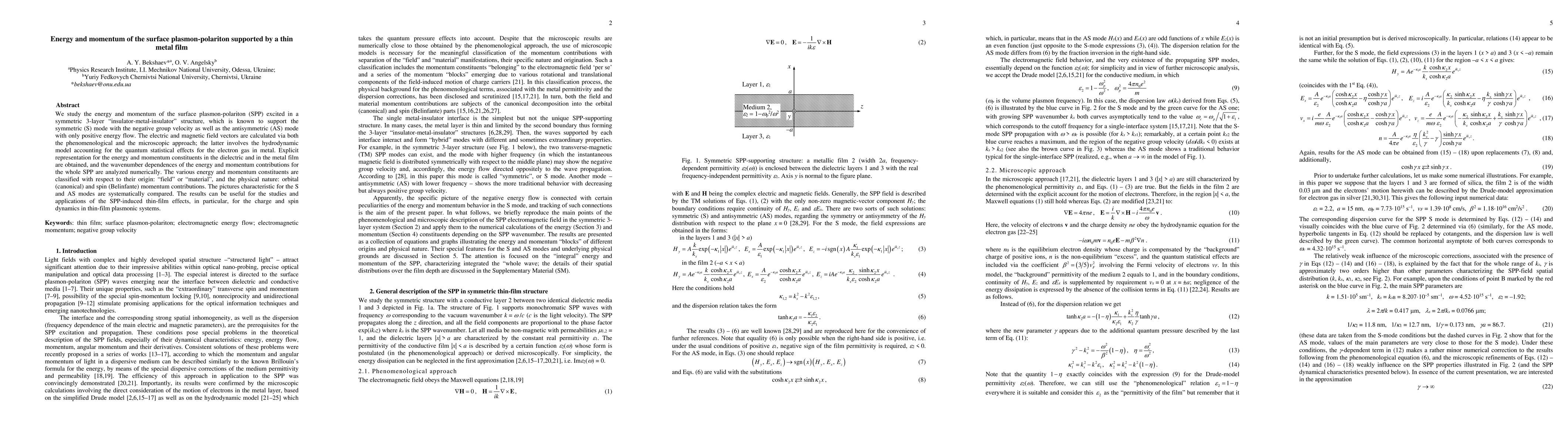 We study the energy and momentum of the surface plasmon-polariton (SPP) excited in a symmetric 3-layer "insulator-metal-insulator" structure, which is known to support the symmetric (S) mode with the negative group velocity as well as the antisymmetric (AS) mode with only positive energy flow. The electric and magnetic field vectors are calculated via both the phenomenological and the microscopic approach; the latter involves the hydrodynamic model accounting for the quantum statistical effects for the electron gas in metal. Explicit representation for the energy and momentum constituents in the dielectric and in the metal film are obtained, and the wavenumber dependences of the energy and momentum contributions for the whole SPP are analyzed numerically. The various energy and momentum constituents are classified with respect to their origin: "field" or "material", and the physical nature: orbital (canonical) and spin (Belinfante) momentum contributions. The pictures characteristic for the S and AS modes are systematically compared. The results can be useful for the studies and applications of the SPP-induced thin-film effects, in particular, for the charge and spin dynamics in thin-film plasmonic systems.