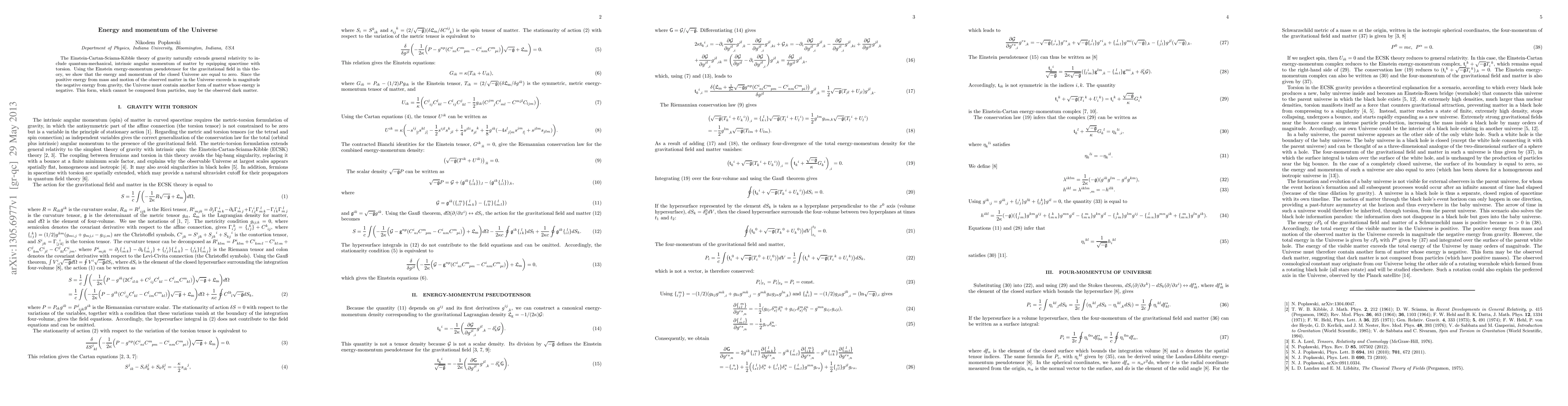 The Einstein-Cartan-Sciama-Kibble theory of gravity reveals that the energy and momentum of a closed Universe sum to zero, suggesting the presence of a negative energy form, possibly dark matter, balancing the positive energy from mass and motion. This theory incorporates quantum-mechanical intrinsic angular momentum through spacetime torsion.