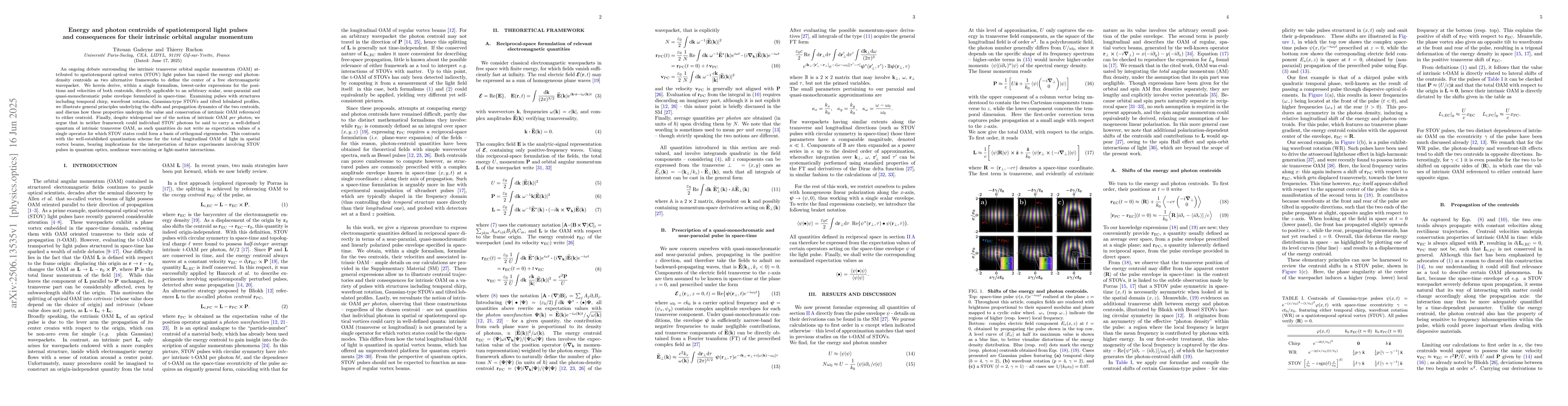 An ongoing debate surrounding the intrinsic transverse orbital angular momentum (OAM) attributed to spatiotemporal optical vortex (STOV) light pulses has raised the energy and photon-density centroids as two alternative frameworks to define the center of a free electromagnetic wavepacket. We herein derive, within a single formalism, lowest-order expressions for the positions and velocities of both centroids, directly applicable to an arbitrary scalar, near-paraxial and quasi-monochromatic pulse envelope formulated in space-time. Examining pulses with structures including temporal chirp, wavefront rotation, Gaussian-type STOVs and tilted lobulated profiles, we illustrate general principles underlying the shifts and propagation dynamics of the two centroids, and discuss how these properties underpin the value and conservation of intrinsic OAM referenced to either centroid. Finally, despite widespread use of the notion of intrinsic OAM "per photon", we argue that in neither framework could individual STOV photons be said to carry a well-defined quantum of intrinsic transverse OAM, as such quantities do not write as expectation values of a single operator for which STOV states could form a basis of orthogonal eigenmodes. This contrasts with the well-established quantization scheme for the total longitudinal OAM of light in spatial vortex beams, bearing implications for the interpretation of future experiments involving STOV pulses in quantum optics, nonlinear wave-mixing or light-matter interactions.