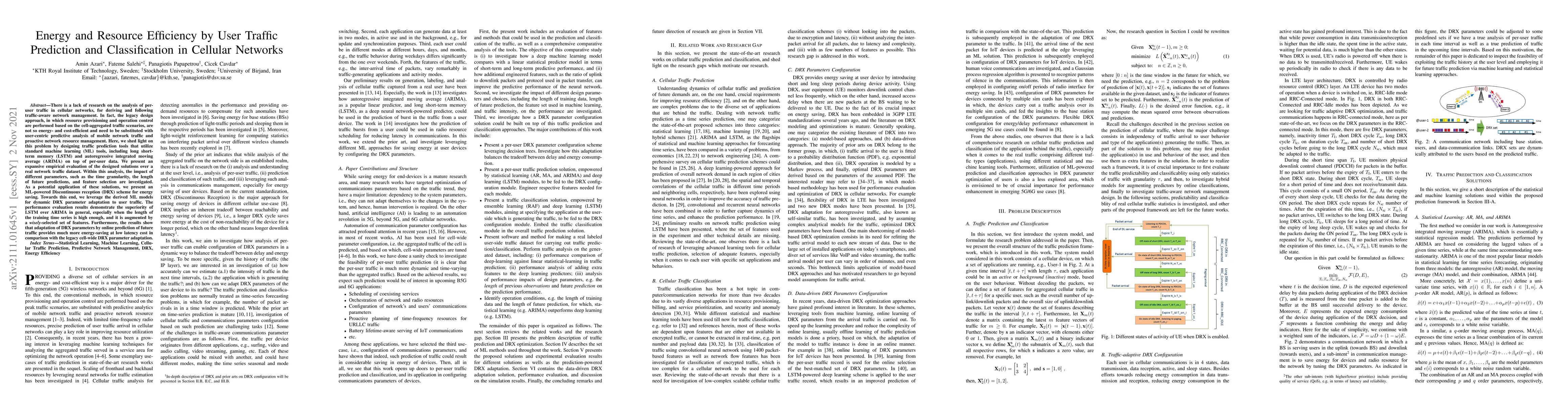 This paper proposes machine learning tools, including LSTM and ARIMA, for predicting and classifying individual user traffic in cellular networks to enhance energy and resource efficiency. The study demonstrates that LSTM outperforms ARIMA in traffic prediction, especially with longer training data, and shows that adaptive Discontinuous reception (DRX) parameters based on user traffic predictions significantly improve energy savings compared to traditional cell-wide DRX adaptation.