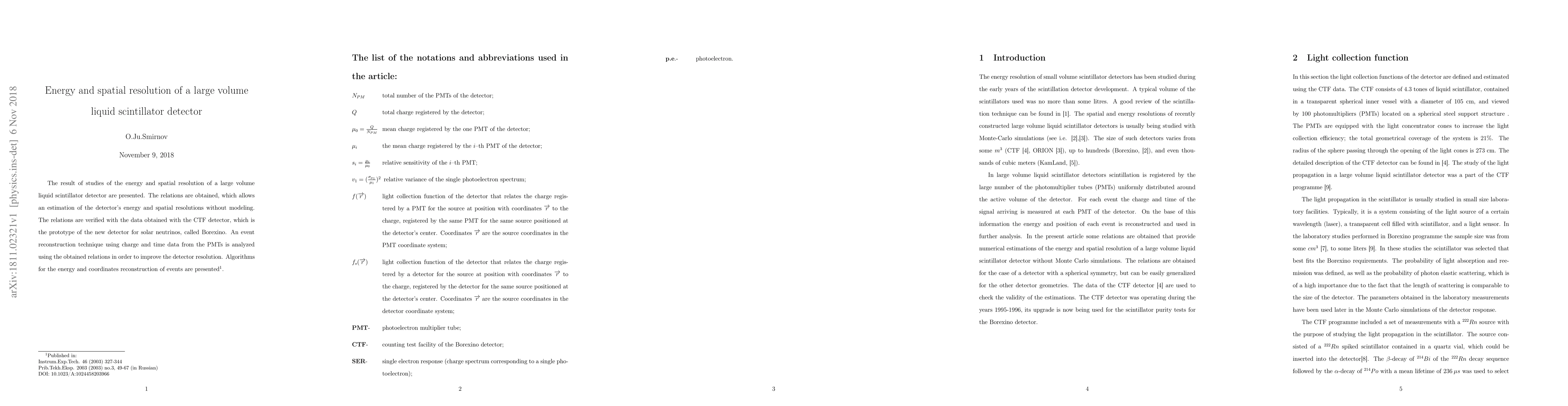 This paper presents studies on the energy and spatial resolution of a large volume liquid scintillator detector, deriving relations that estimate resolution without modeling. The findings are validated using the CTF detector prototype, and an event reconstruction technique is analyzed to enhance detector resolution.