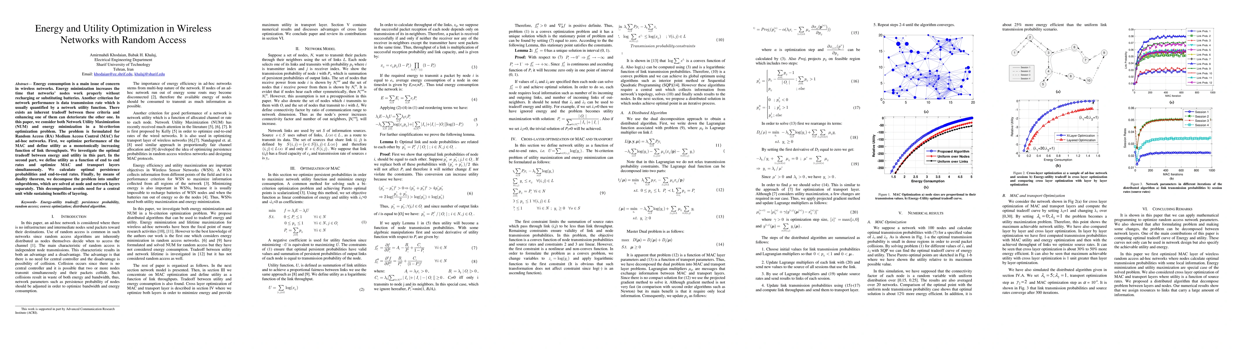 This paper addresses the dual optimization of energy minimization and network utility maximization in wireless networks using Random Access MAC protocols. It formulates a bi-criterion optimization problem, decomposes it using duality, and optimizes both MAC and transport layers to achieve the best tradeoff between energy efficiency and data transmission rate.