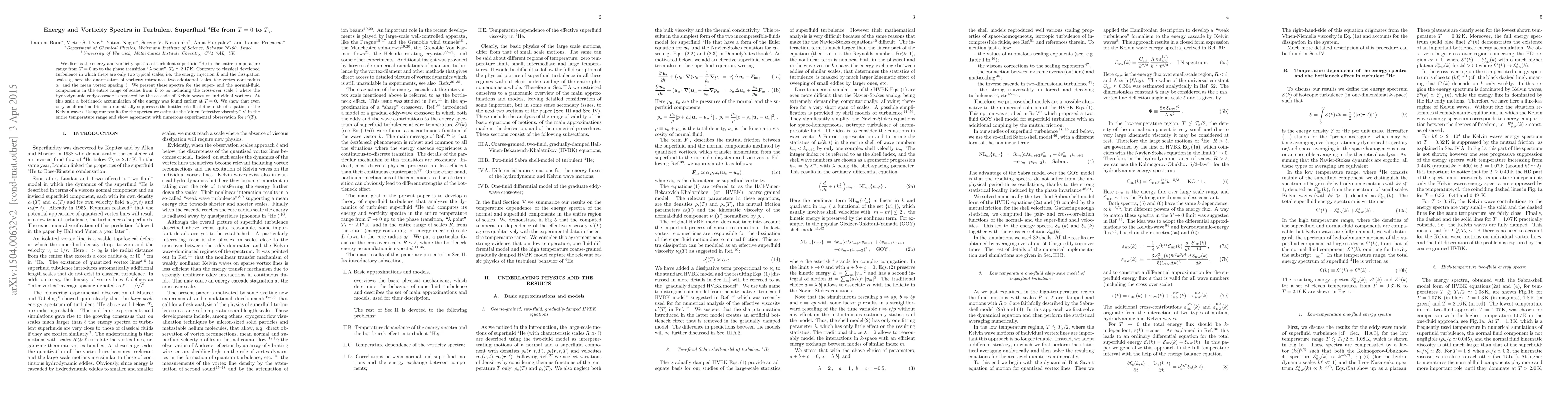 We discuss the energy and vorticity spectra of turbulent superfluid $^4$He in all the temperature range from $T=0$ up to the phase transition "$\lambda$ point", $T_\lambda\simeq 2.17\,$K. Contrary to classical developed turbulence in which there are only two typical scales, i.e. the energy injection $L$ and the dissipation scales $\eta$, here the quantization of vorticity introduces two additional scales, i.e the vortex core radius $a_0$ and the mean vortex spacing $\ell$. We present these spectra for the super- and normal-fluid components in the entire range of scales from $L$ to $a_0$ including the cross-over scale $\ell$ where the hydrodynamic eddy-cascade is replaced by the cascade of Kelvin waves on individual vortices. At this scale a bottleneck accumulation of the energy was found earlier at $T=0$. We show that even very small mutual friction dramatically suppresses the bottleneck effect due to the dissipation of the Kelvin waves. Using our results for the spectra we estimate the Vinen "effective viscosity" $\nu'$ in the entire temperature range and show agreement with numerous experimental observation for $\nu'(T)$.