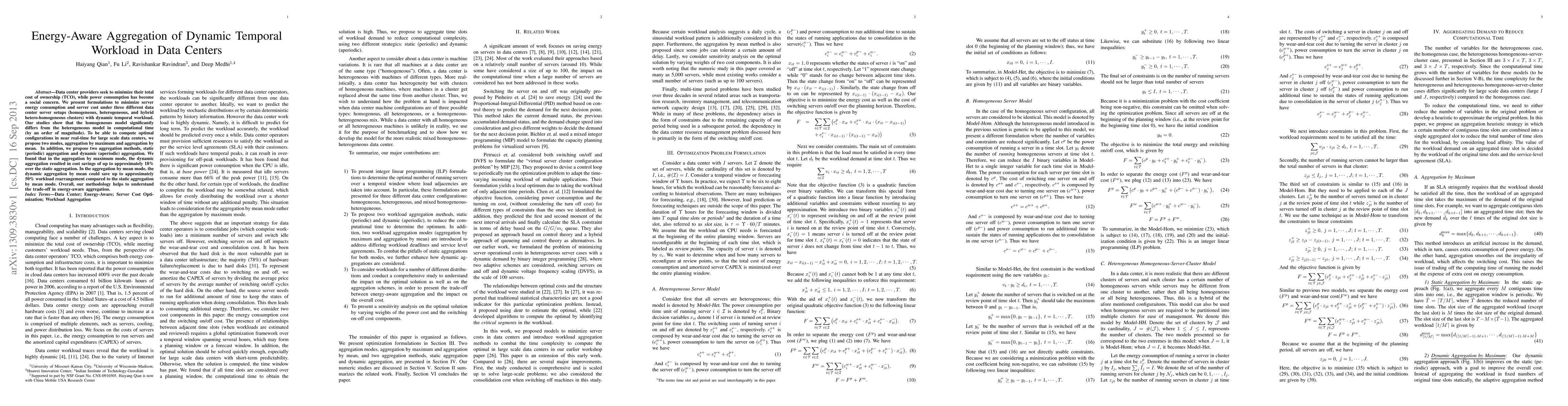 Data center providers seek to minimize their total cost of ownership (TCO), while power consumption has become a social concern. We present formulations to minimize server energy consumption and server cost under three different data center server setups (homogeneous, heterogeneous, and hybrid hetero-homogeneous clusters) with dynamic temporal workload. Our studies show that the homogeneous model significantly differs from the heterogeneous model in computational time (by an order of magnitude). To be able to compute optimal configurations in near real-time for large scale data centers, we propose two modes, aggregation by maximum and aggregation by mean. In addition, we propose two aggregation methods, static (periodic) aggregation and dynamic (aperiodic) aggregation. We found that in the aggregation by maximum mode, the dynamic aggregation resulted in cost savings of up to approximately 18% over the static aggregation. In the aggregation by mean mode, the dynamic aggregation by mean could save up to approximately 50% workload rearrangement compared to the static aggregation by mean mode. Overall, our methodology helps to understand the trade-off in energy-aware aggregation.