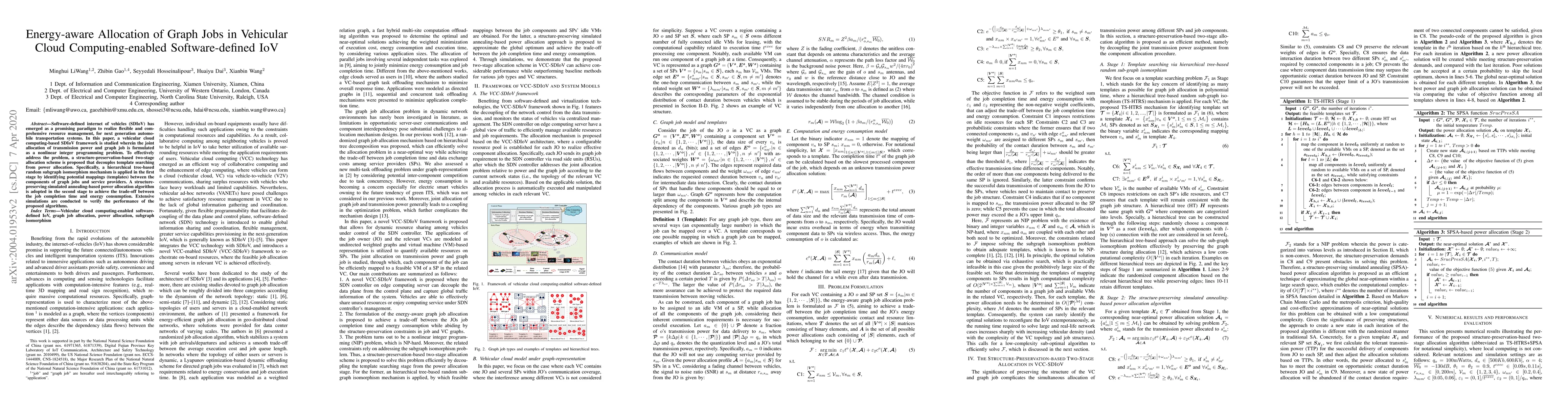 A new algorithm is proposed for efficiently allocating energy in vehicles using a software-defined internet of vehicles framework, balancing job completion time and energy consumption. The algorithm uses a two-stage approach to identify potential mappings between graph jobs and service providers.