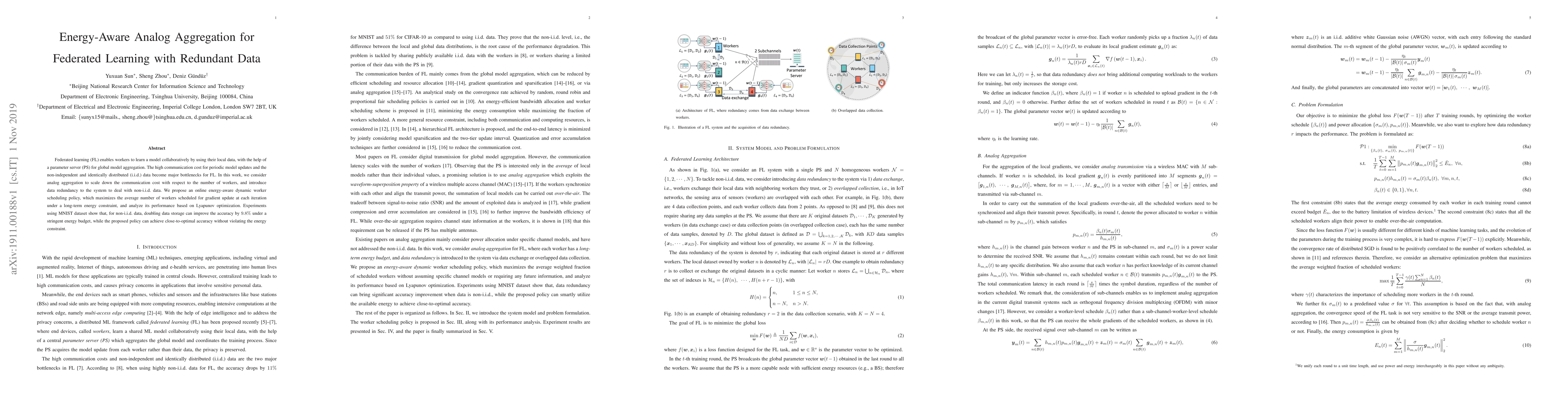 This research proposes an energy-efficient method for federated learning using analog aggregation and data redundancy, demonstrating that doubling data storage can enhance accuracy by 9.8% under strict energy limits. An online energy-aware scheduling policy maximizes worker participation while adhering to energy constraints, achieving near-optimal accuracy without violations.