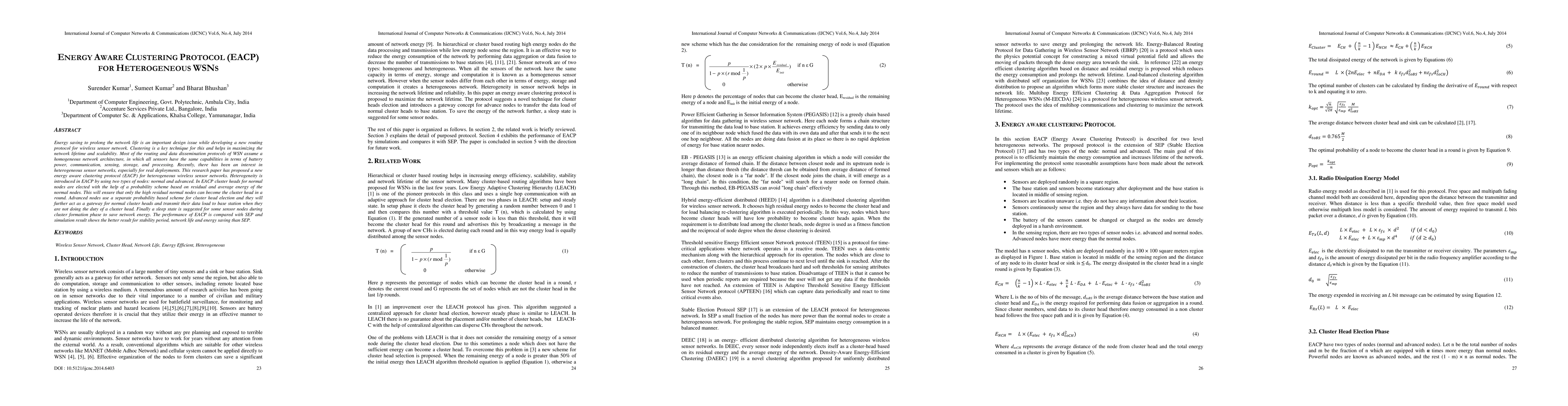 A new clustering protocol (EACP) is proposed for heterogeneous wireless sensor networks to maximize energy efficiency and prolong network life. It uses a probability-based scheme to elect cluster heads and suggests sleep states to save energy.
