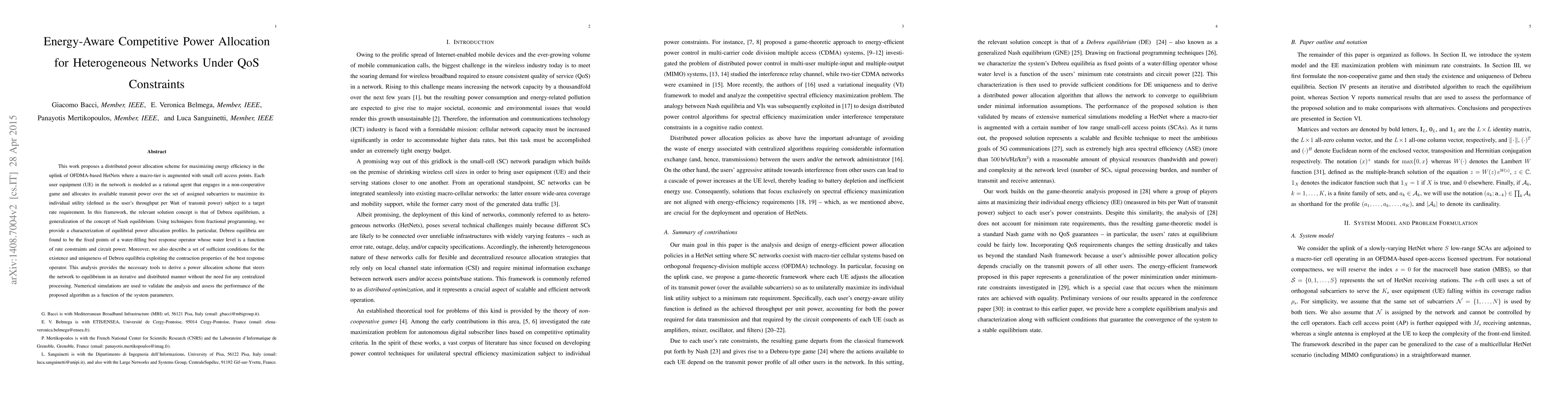 This work proposes a distributed power allocation scheme for maximizing energy efficiency in the uplink of orthogonal frequency-division multiple access (OFDMA)-based heterogeneous networks (HetNets). The user equipment (UEs) in the network are modeled as rational agents that engage in a non-cooperative game where each UE allocates its available transmit power over the set of assigned subcarriers so as to maximize its individual utility (defined as the user's throughput per Watt of transmit power) subject to minimum-rate constraints. In this framework, the relevant solution concept is that of Debreu equilibrium, a generalization of Nash equilibrium which accounts for the case where an agent's set of possible actions depends on the actions of its opponents. Since the problem at hand might not be feasible, Debreu equilibria do not always exist. However, using techniques from fractional programming, we provide a characterization of equilibrial power allocation profiles when they do exist. In particular, Debreu equilibria are found to be the fixed points of a water-filling best response operator whose water level is a function of minimum rate constraints and circuit power. Moreover, we also describe a set of sufficient conditions for the existence and uniqueness of Debreu equilibria exploiting the contraction properties of the best response operator. This analysis provides the necessary tools to derive a power allocation scheme that steers the network to equilibrium in an iterative and distributed manner without the need for any centralized processing. Numerical simulations are then used to validate the analysis and assess the performance of the proposed algorithm as a function of the system parameters.
