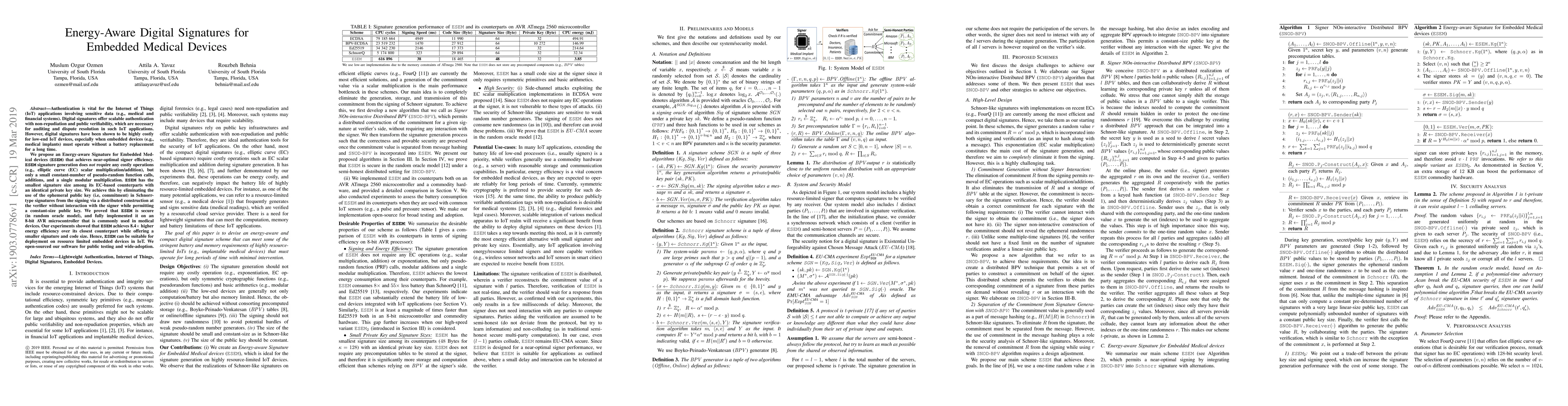 Authentication is vital for the Internet of Things (IoT) applications involving sensitive data (e.g., medical and financial systems). Digital signatures offer scalable authentication with non-repudiation and public verifiability, which are necessary for auditing and dispute resolution in such IoT applications. However, digital signatures have been shown to be highly costly for low-end IoT devices, especially when embedded devices (e.g., medical implants) must operate without a battery replacement for a long time. We propose an Energy-aware Signature for Embedded Medical devices (ESEM) that achieves near-optimal signer efficiency. ESEM signature generation does not require any costly operations (e.g., elliptic curve (EC) scalar multiplication/addition), but only a small constant-number of pseudo-random function calls, additions, and a single modular multiplication. ESEM has the smallest signature size among its EC-based counterparts with an identical private key size. We achieve this by eliminating the use of the ephemeral public key (i.e, commitment) in Schnorr-type signatures from the signing via a distributed construction at the verifier without interaction with the signer while permitting a constant-size public key. We proved that ESEM is secure (in random oracle model), and fully implemented it on an 8-bit AVR microcontroller that is commonly used in medical devices. Our experiments showed that ESEM achieves 8.4x higher energy efficiency over its closest counterpart while offering a smaller signature and code size. Hence, ESEM can be suitable for deployment on resource limited embedded devices in IoT. We open-sourced our software for public testing and wide-adoption.