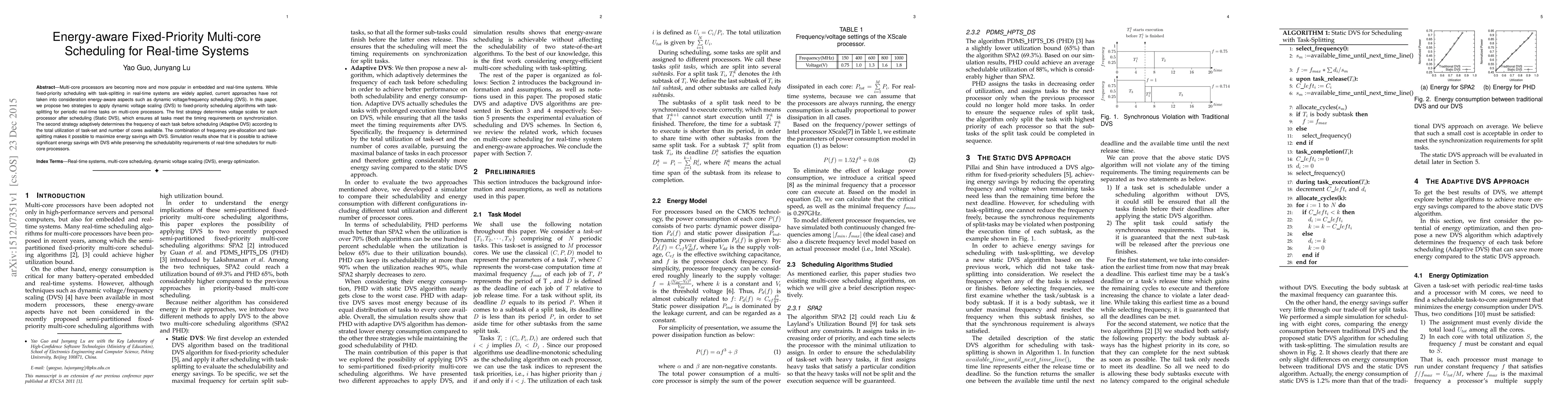 This paper proposes two energy-aware strategies for fixed-priority scheduling on multi-core processors in real-time systems, integrating dynamic voltage scaling (DVS). The Static DVS determines voltage scales post-scheduling, while Adaptive DVS adjusts frequencies pre-scheduling based on task utilization and core availability, achieving significant energy savings without compromising schedulability.