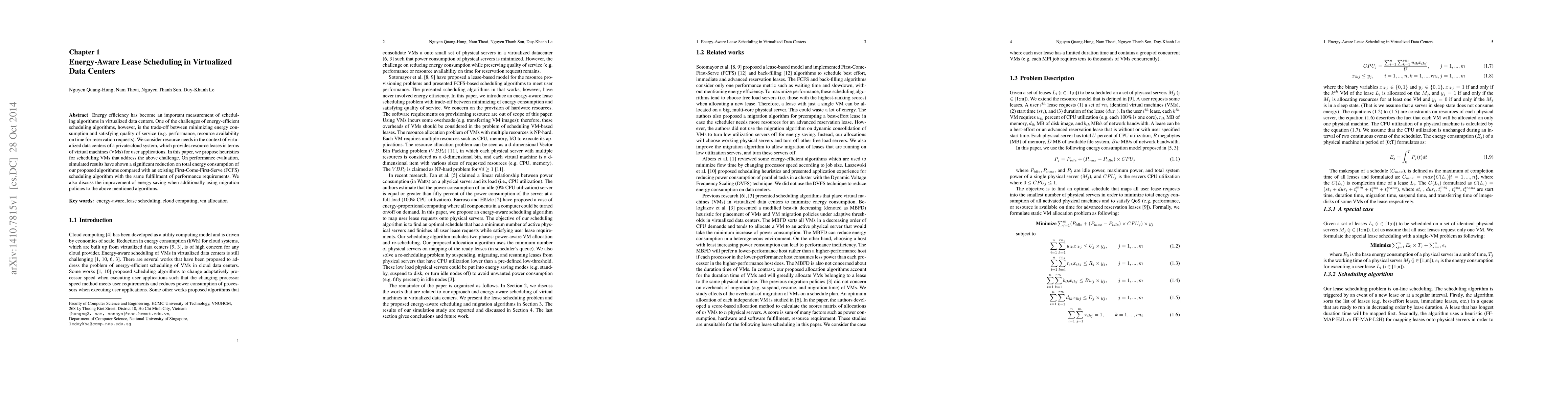 This paper proposes heuristics for energy-aware scheduling of virtual machines (VMs) in virtualized data centers, balancing energy efficiency with performance requirements. Simulation results show a significant reduction in energy consumption compared to the FCFS algorithm while maintaining performance, and further improvements are observed with migration policies.