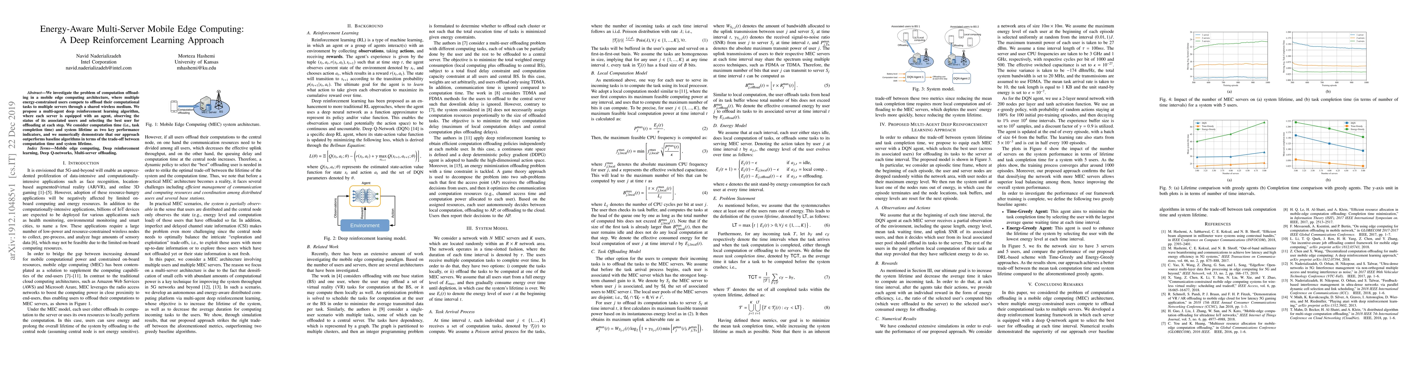 This paper proposes a multi-agent deep reinforcement learning algorithm for computation offloading in a mobile edge computing environment, optimizing task completion time and system lifetime. The approach outperforms baseline methods by dynamically selecting the best users for offloading based on observed user statuses.