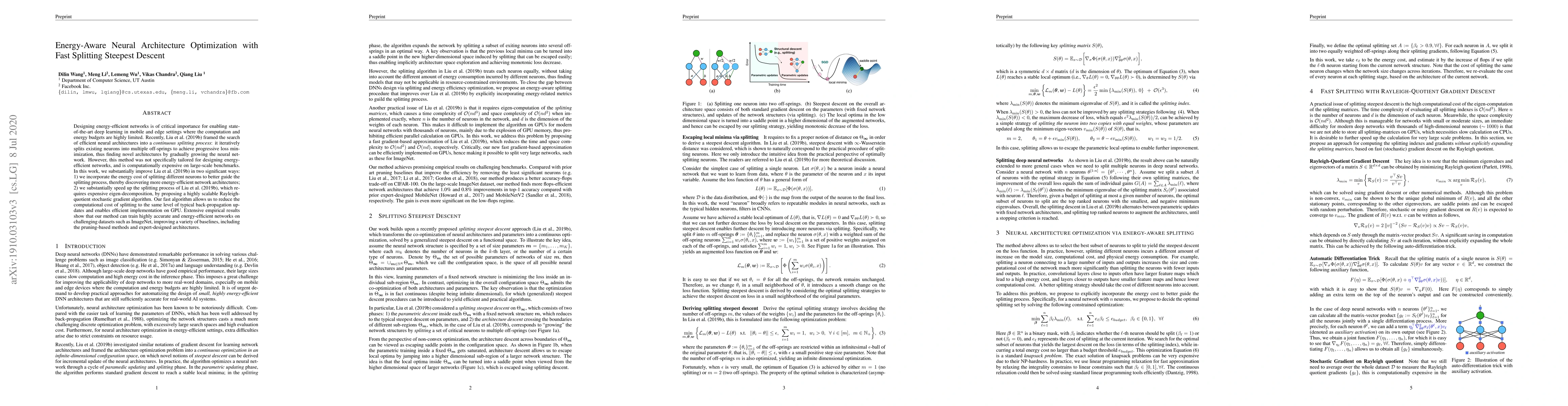 This paper proposes an energy-aware neural architecture optimization method that incorporates neuron splitting costs and introduces a fast splitting algorithm to improve efficiency. The new approach discovers more energy-efficient networks while significantly reducing computational costs, enabling effective implementation on GPUs and outperforming baselines on datasets like ImageNet.