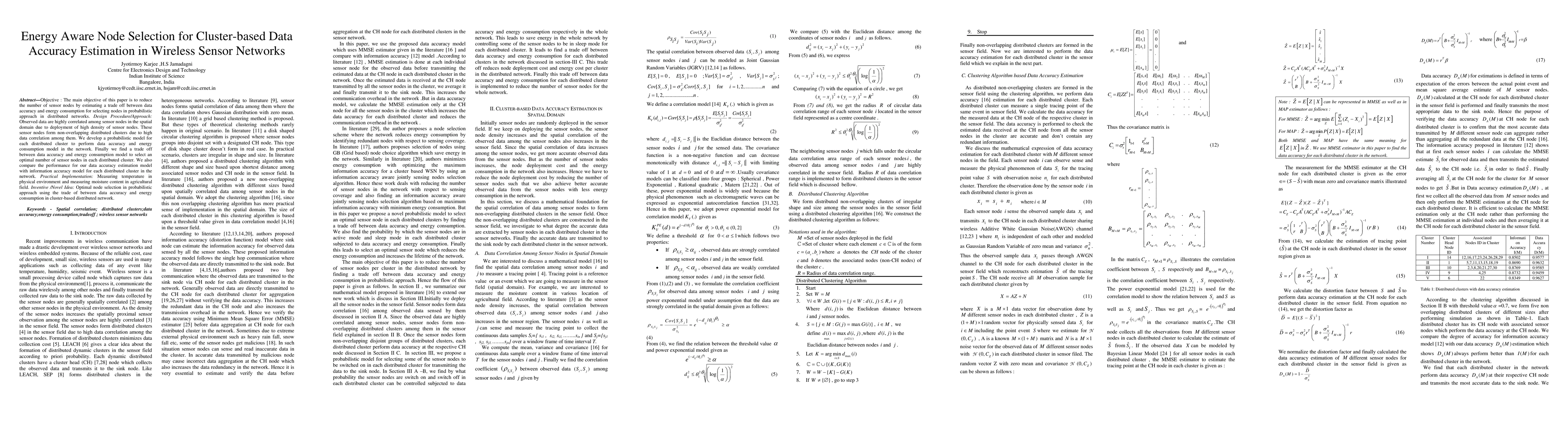 The main objective of this paper is to reduce the number of sensor nodes by estimating a trade off between data accuracy and energy consumption for selecting nodes in probabilistic approach in distributed networks. Design Procedure/Approach: Observed data are highly correlated among sensor nodes in the spatial domain due to deployment of high density of sensor nodes. These sensor nodes form non-overlapping distributed clusters due to high data correlation among them. We develop a probabilistic model for each distributed cluster to perform data accuracy and energy consumption model in the network. Finally we find a trade off between data accuracy and energy consumption model to select an optimal number of sensor nodes in each distributed cluster. We also compare the performance for our data accuracy estimation model with information accuracy model for each distributed cluster in the network. Practical Implementation: Measuring temperature in physical environment and measuring moisture content in agricultural field. Inventive /Novel Idea: Optimal node selection in probabilistic approach using the trade of between data accuracy and energy consumption in cluster-based distributed network.