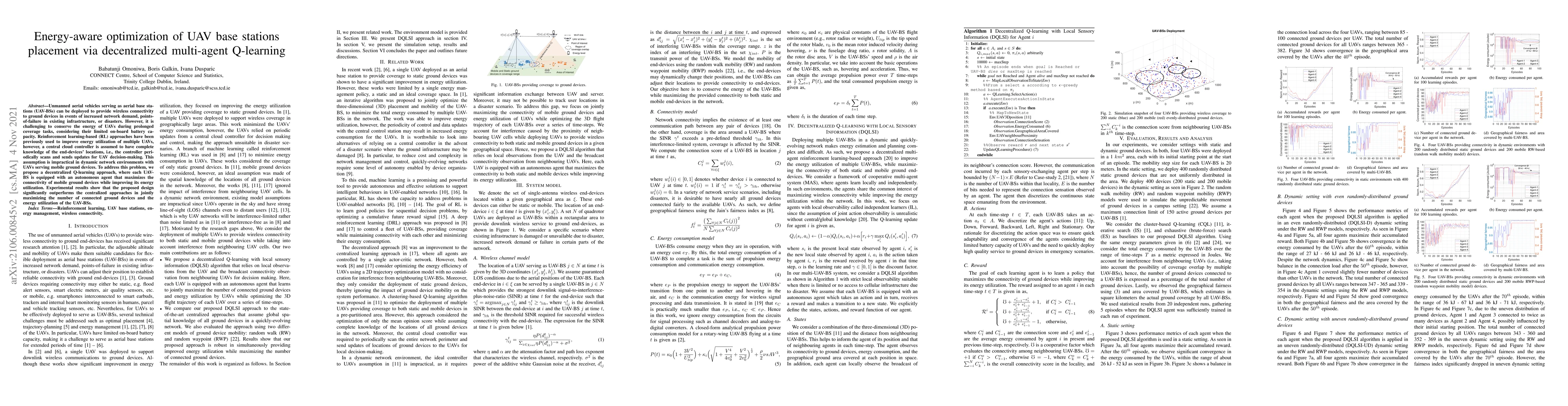 This paper proposes a decentralized multi-agent Q-learning approach to optimize the placement of UAV base stations for energy conservation while maximizing connectivity to mobile ground devices. The decentralized method outperforms centralized approaches by effectively managing energy utilization and connectivity in dynamic environments.