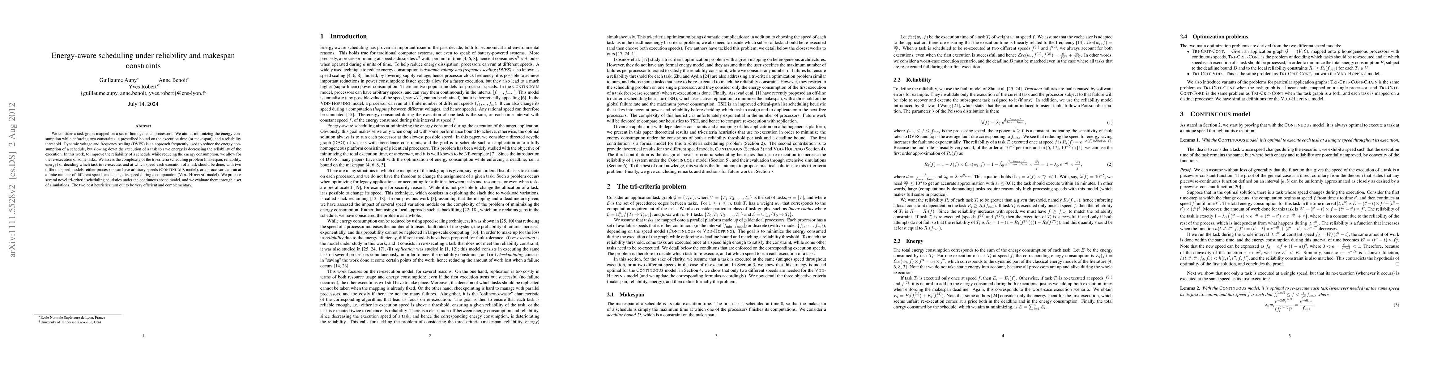 This paper addresses energy-aware scheduling for task graphs on homogeneous processors, aiming to minimize energy consumption while ensuring a makespan and reliability threshold. It proposes novel heuristics for tri-criteria scheduling under different speed models and evaluates them through simulations, finding the best heuristics to be efficient and complementary.