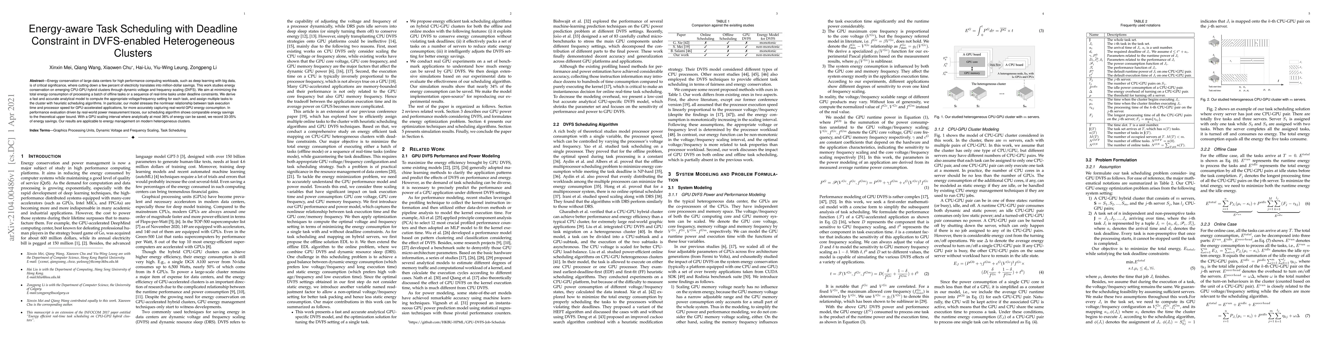 This paper proposes an energy-aware task scheduling method for DVFS-enabled heterogeneous CPU-GPU clusters to minimize energy consumption under deadline constraints. It introduces an analytical model and heuristic scheduling algorithms to optimize voltage/frequency settings, achieving 33-35% energy savings in real-world scenarios.