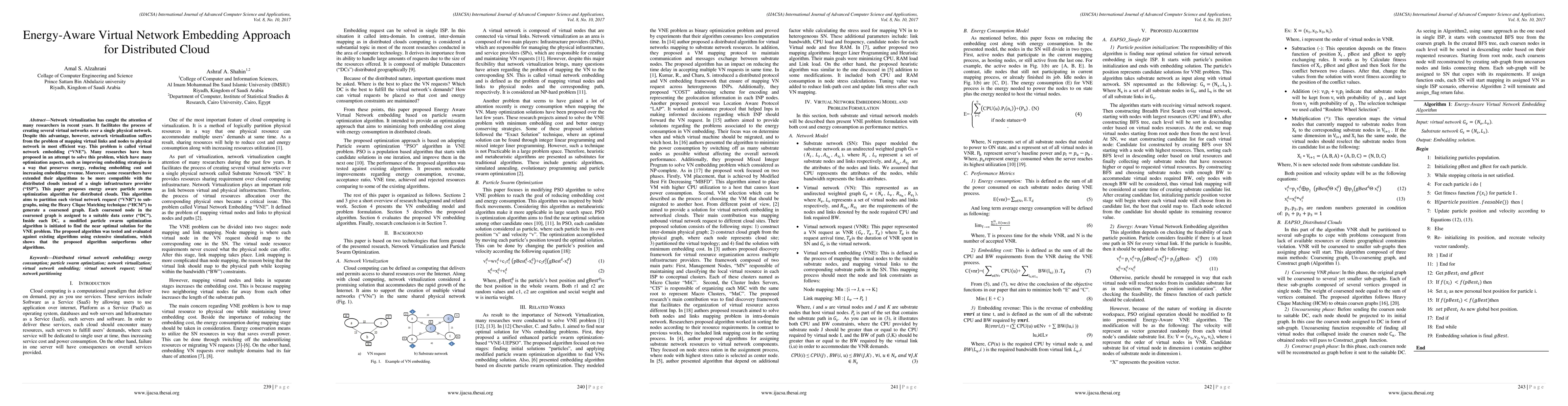 This paper proposes an energy-aware particle swarm optimization algorithm for embedding virtual networks in distributed cloud environments. The approach uses the Heavy Clique Matching technique to partition virtual network requests and optimizes embedding strategies within data centers to minimize energy consumption and costs.