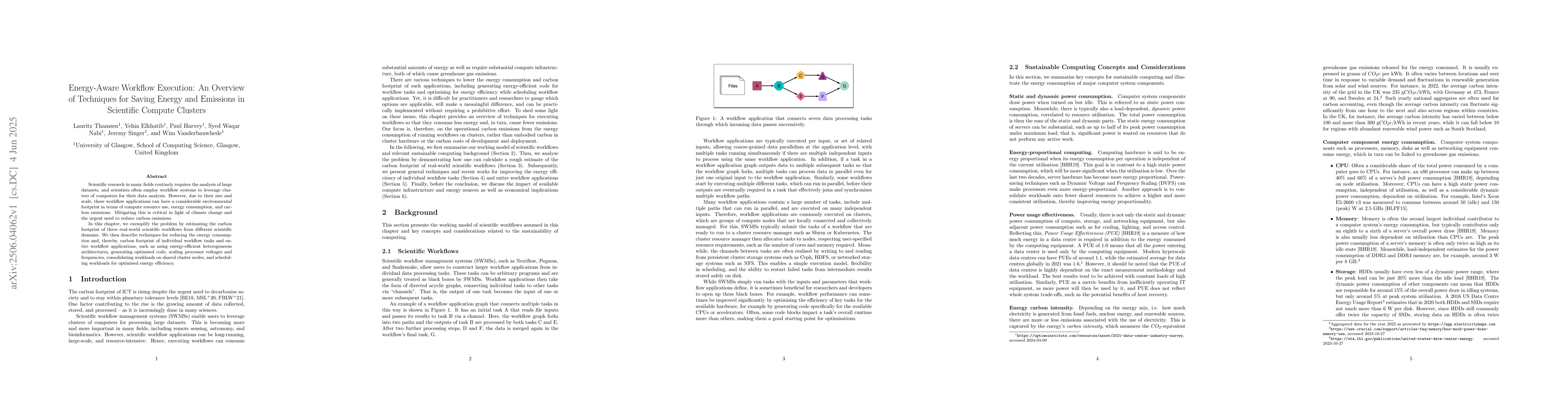 This paper explores ways to reduce energy consumption in scientific computing clusters by optimizing workflow execution techniques. It highlights methods for saving energy and emissions through architectures, code optimization, scaling processor voltages and frequencies.