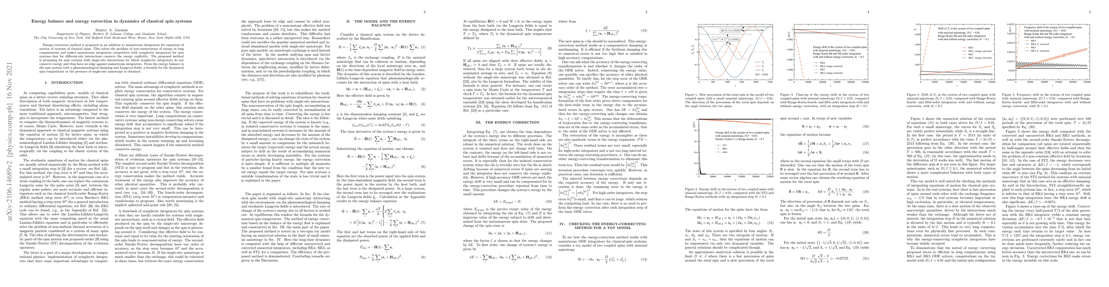 Energy-correction method is proposed as an addition to mainstream integrators for equations of motion of systems of classical spins. This solves the problem of non-conservation of energy in long computations and makes mainstream integrators competitive with symplectic integrators for spin systems that for different-site interactions conserve the energy explicitly. The proposed method is promising for spin systems with single-site interactions for which symplectic integrators do not conserve energy and thus have no edge against mainstream integrators. From the energy balance in the spin system with a phenomenological damping and Langevin fields, a formula for the dynamical spin temperature in the presence of single-site anisotropy is obtained.